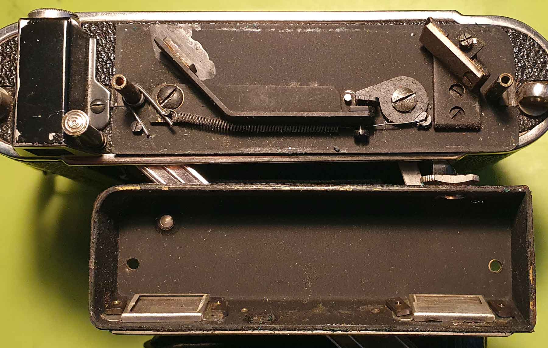 Der gekuppelte Entfernungsmesser (Plaubel Telemeter) liefert über Spiegel einen zweigeteilten Motivausschnitt, der nicht mit dem aufzunehmenden Bildausschnitt übereinstimmt (Darstellung in natürlicher Größe). Der aufzunehmende Bildausschnitt wird im separaten Fernrohrsucher festgelegt. Dieser Plaubel Telemeter findet sich auch an der Makina II. Da bei meiner Roll-Op einer der Spiegel seine Silberschicht verloren hatte, habe ich den Deckel mal geöffnet und den defekten Spiegel durch einen aus Edelstahl ersetzt. Hier ein Blick auf die einfache Konstruktion des Entfernungsmessers: