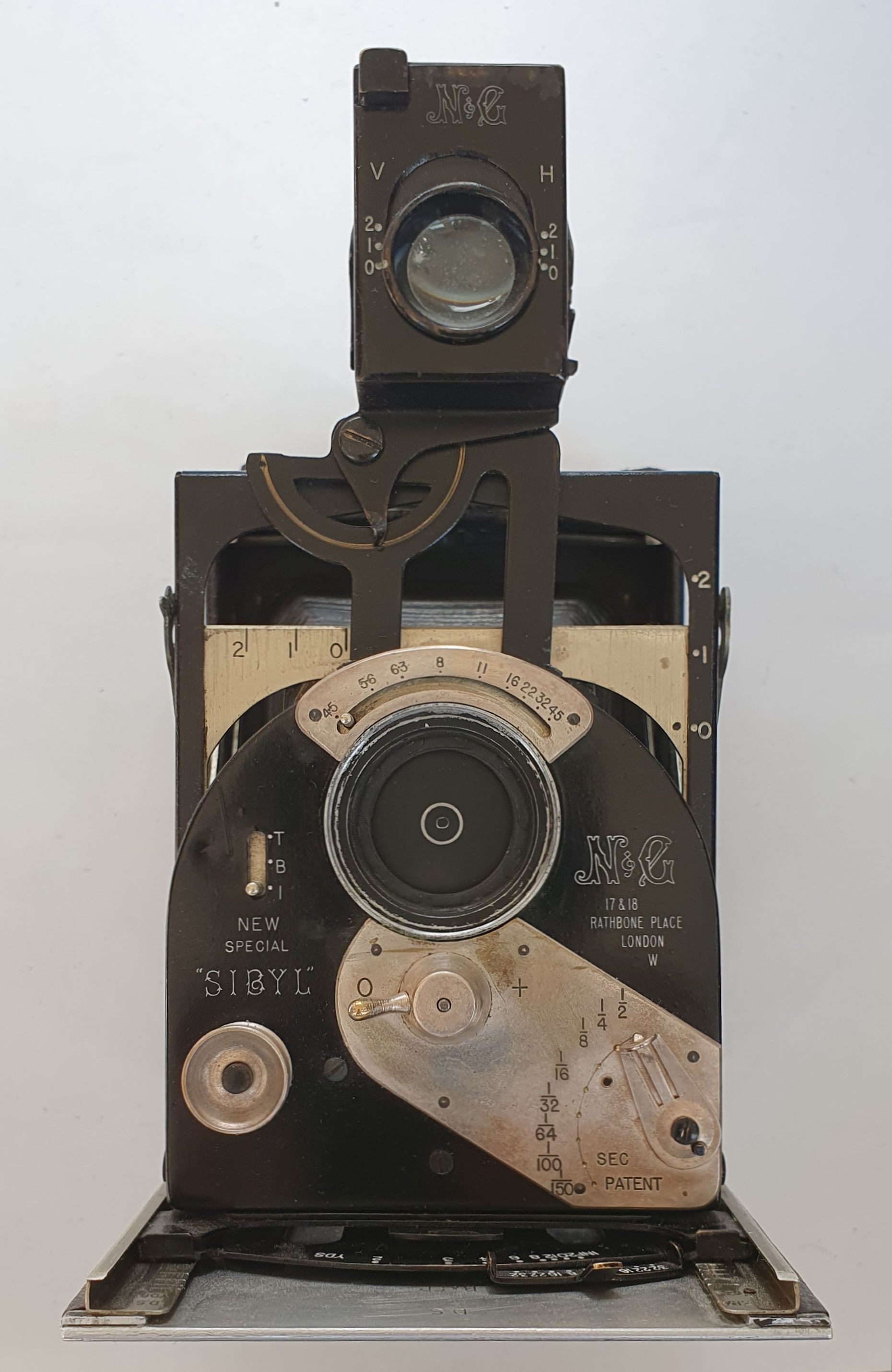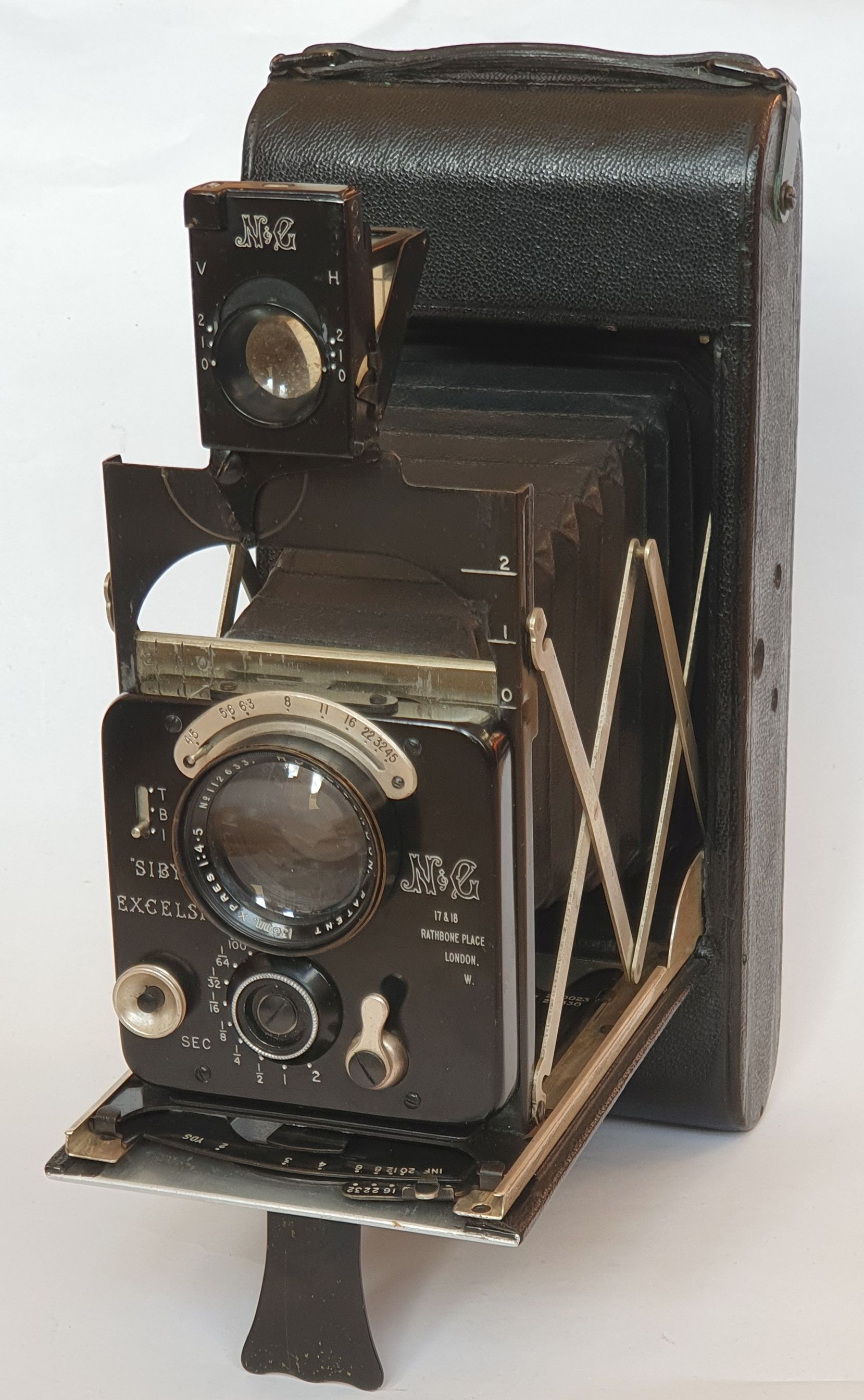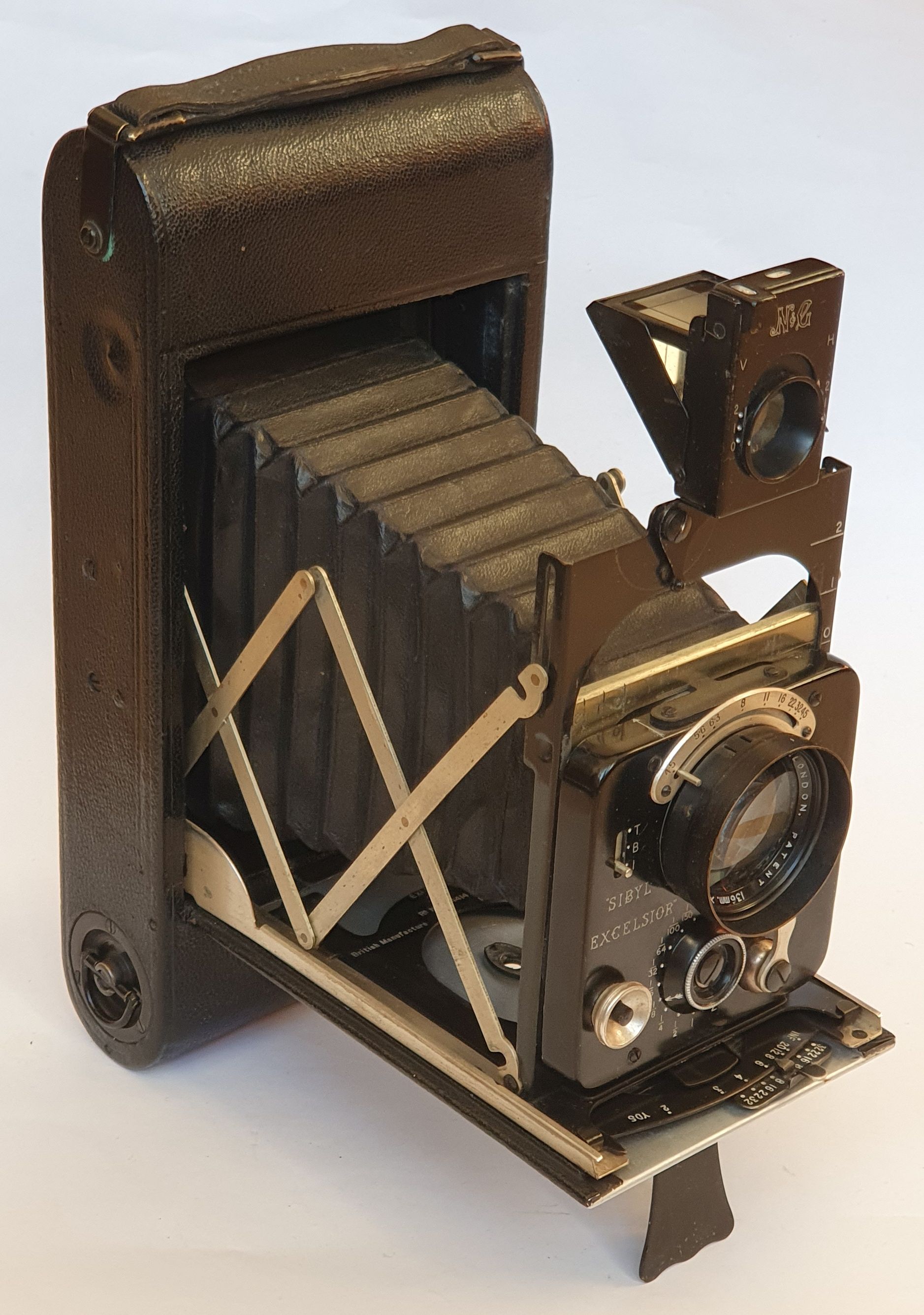 ich habe gerade eine neue Kamera bekommen die ich gern mal zeige. Die Newman & Guardia Sibyl Excelsior ist eine Laufbodenkamera für Aufnahmen im Format 2 ½ x 4 ¼ Zoll für 116er Rollfilm, die im Vereinigten Königreich von 1927 bis (ca.) 1933 hergestellt wurde. Es gab ein fast baugleiches kastenförmiges Model, die „Sibyl Vitesse“ für Platten. Mein Exemplar trägt die Seriennummer 114, bei Chrisbies gab es 2002 ein Exemplar mit der höchsten mit bekannten Nummer von 198 zu versteigern. Bei Erly Photography vermutet man, dass mit der Nr. 100 beginnend nur 100 Stück hergestellt wurden. Die Verkauspreise von Versteigerungen reichen von 175 bis 3.750 € (Leitz Photograpica Auktion) bei ähnlichem Erhaltungszustand – das ist irgendwie erstaunlich. Die meisten Kameras werden für einen unteren 3-Stellingen Betrag verkauft oder angeboten. Eigentlich schade, denn würde auf dem Gerät Leica draufstehen, könnte man davon ziemlich gut Essen gehen.