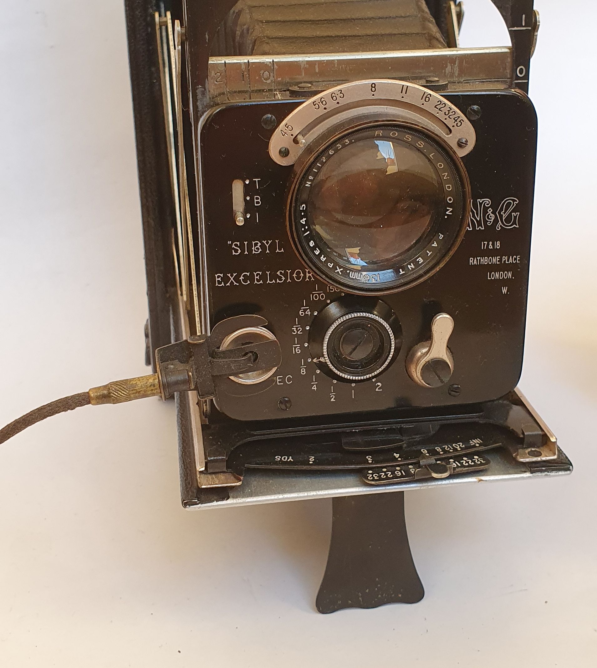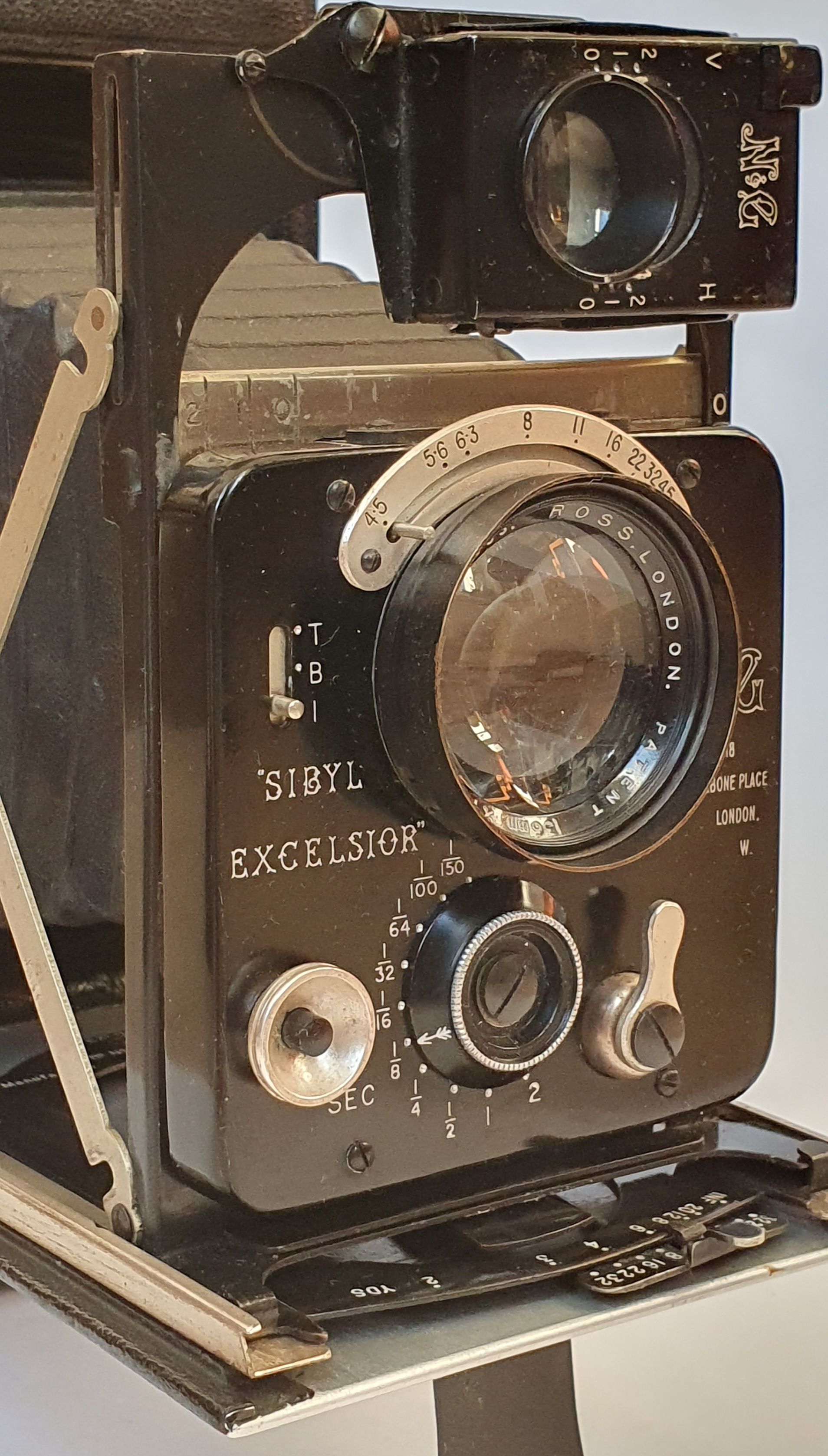 Der Excelsior-Verschluss ist eine verbesserte Version des Verschlusses der New Ideal Sibyl. Die Verschlusslamellen werden durch eine Nocke gesteuert, die das Öffnen und Schließen der Lamellen bewirkt. Bei früheren Modellen wurden die Lamellen direkt vom Pneumatikzylinder gesteuert. Die Nocke verlangsamt die Lamellen während der Belichtungsmitte und beschleunigt die Lamellenbewegung beim Öffnen und Schließen des Objektivs. Das Objektiv ist ein Ross Xpres f 4.5, 136mm (was das für ein Typ ist weiß ich leider nicht). Die Blendeneinstellung ist wunderbar leichtgängig. Ein schönes Detail, das mich überrascht hat, ist eine kleine zweiteilige Sonnenblende (vermutlich eine Originalausstattung), die zwar nur eine geringe Abschattung bringt aber immerhin.