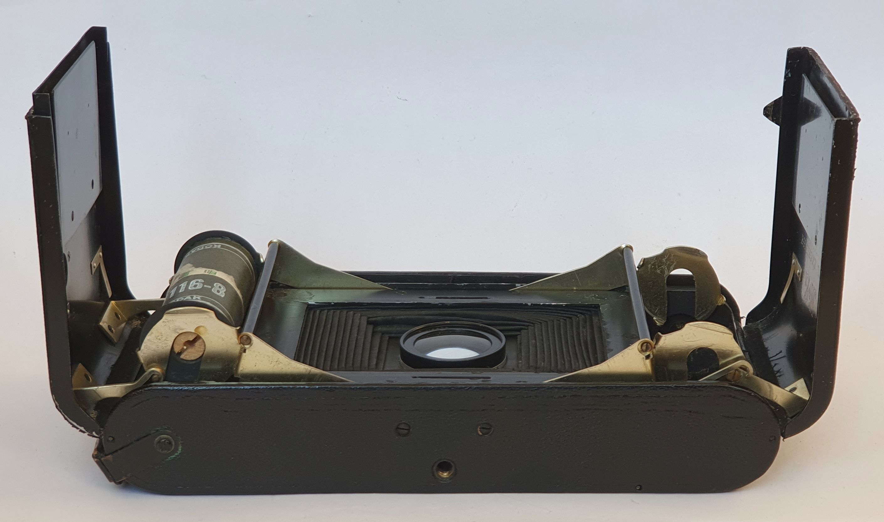 Der Verschluss ermöglicht Zeiten von 2 bis 1/150 Sekunde + B und T, läuft noch über allen Zeiten; innerhalb einer +/- Abweichung von 30 % bewegen sich aber nur noch 5 von 10 Einstellungen. Nachdem ich ein paar Kleinigkeiten gerichtet hatte, ließe sich die Kamera benutzen, gäbe es noch die alten 116er Filme, die man von 1899 bis 1984 kaufen konnte. Da es sich bei der Filmbühne um eine ca. 1 mm starke, einfache, plane Aluplatte handelt, die leicht auszutauschen ist, habe ich vor eine Platte für 120er Rollfilme anzufertigen.