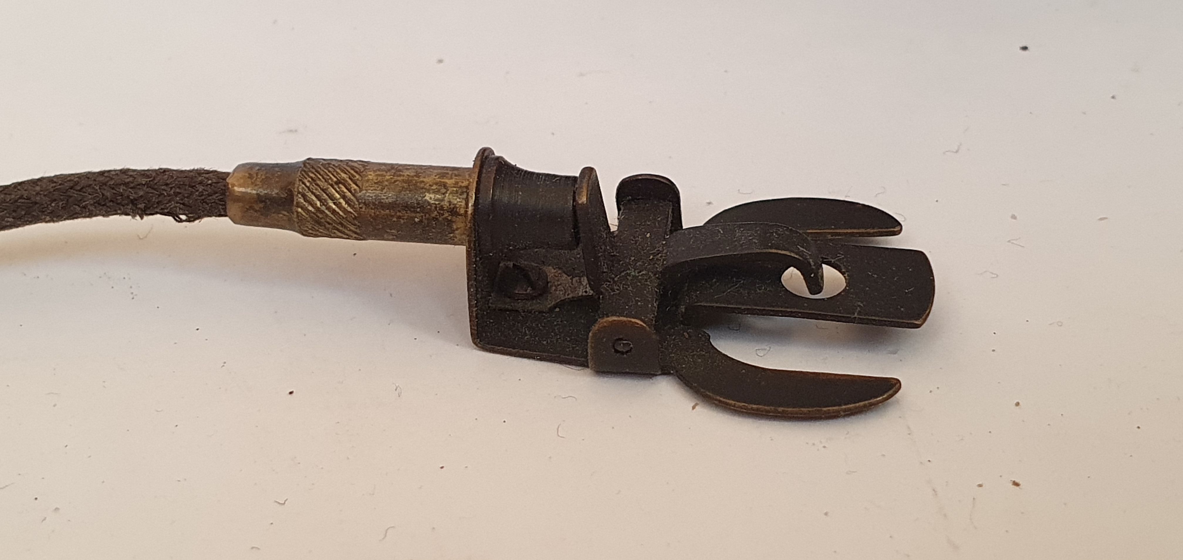 der Knopf neben dem Zeitenrad ist der Auslöseknopf, der ist weder leicht- noch schwergängig, zumindest bewegt sich die Standarte nicht beim Auslösen. Allerdings musste ich die Arretierung der Standarte etwas richten, damit die sich nicht bei der kleinsten Berührung selbstständig macht. Wie ich schon erwähnte, ist vieles etwas filigran, aber richtig eingestellt durchaus funktionell. Einen Anschluss für unser gängiges kegeliches Gewinde für Drahtauslöser gibt es nicht, aber es gab von Newman & Guardia einem besonderen Schuh, den man auf den Konus aufschieben konnte mit dem über eine kleine Hebelumlenkung (Druck von der Seite) in den Konus reingedrückt wird (siehe Bild). Die Hebelarme sind dabei im Verhältnis von ca. 3:1 ungünstig gestaltet und im Drahtauslöser gibt es zusätzlich einiges an Reibung, sodass sich keine meiner Sibyls damit auslösen lässt. Hat vielleicht mal im Neuzustand funktioniert, ist aber für die Ewigkeit auch wieder zu knapp bemessen.