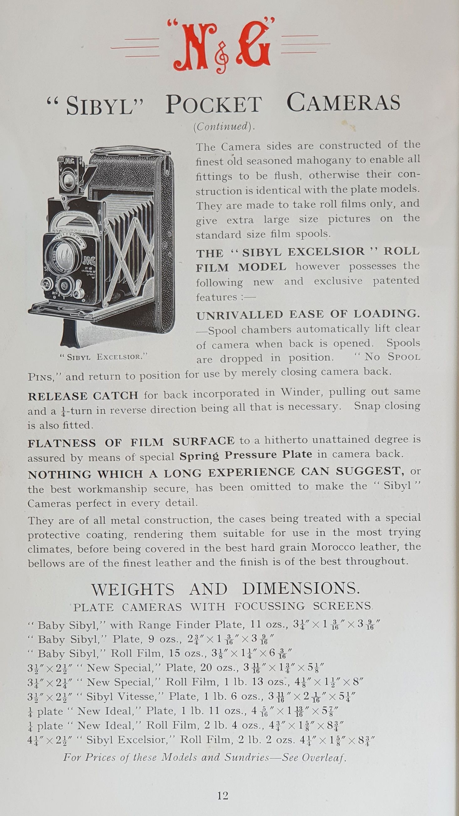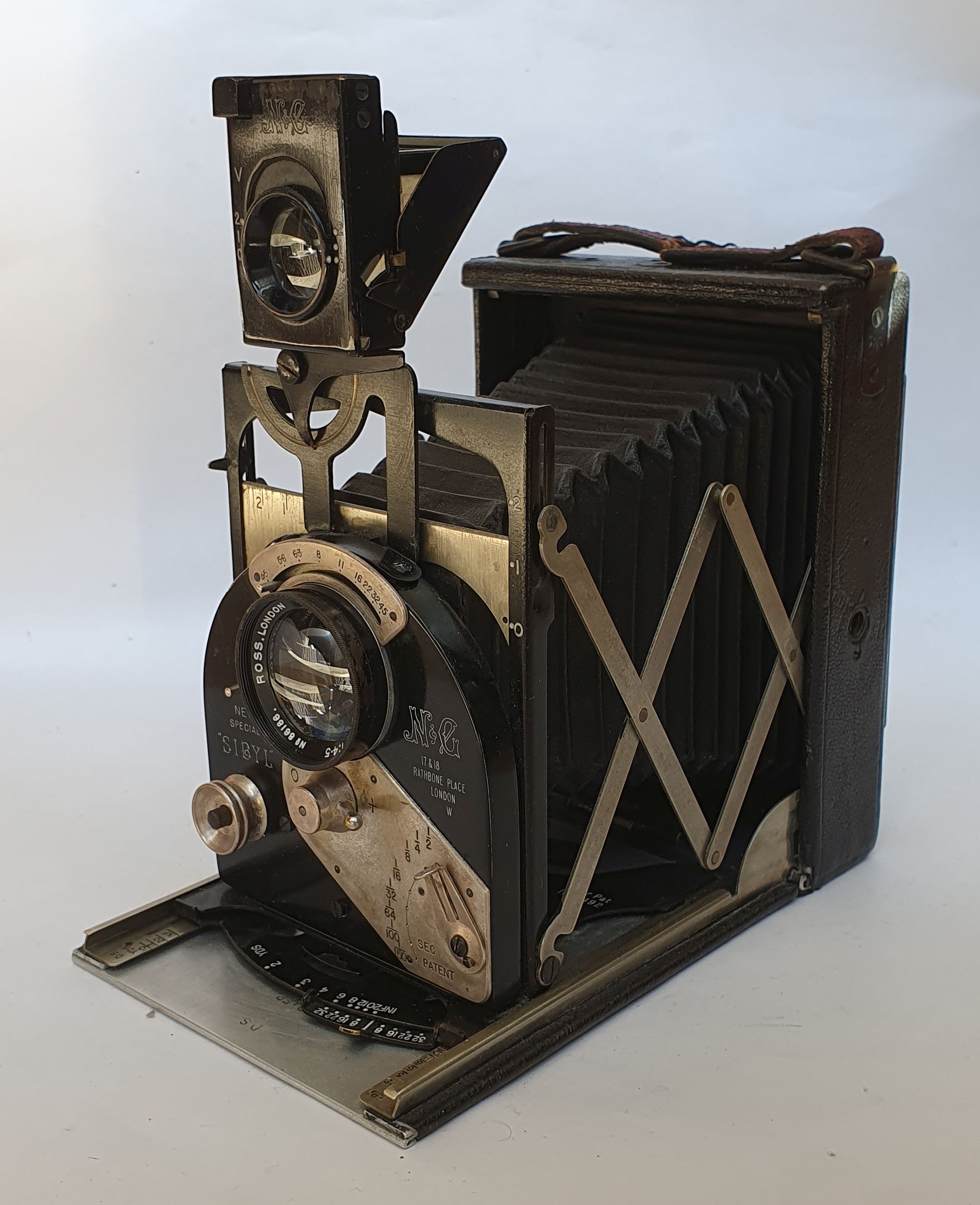 Die Kamera ist vorwiegend aus Aluminium hergestellt und mit feinstem Marokkoleder bezogen. Der Balgen ist gleichfalls aus schwarzem Leder und nach fast 100 Jahren immer noch lichtdicht und flexibel. Sie besitzt die für Newman & Guardia Sibyl-Kameras typischen Scherenstreben, die so filigran sie sind, der Standarte eine sehr gute Stabilität und Ausrichtung geben. Die Frontplatte ist die übliche quadratische Metallplatte, hinter der sich ein pneumatisch gesteuerter Zweiblatt-Schwenkverschluss von Newman & Guardia verbirgt.