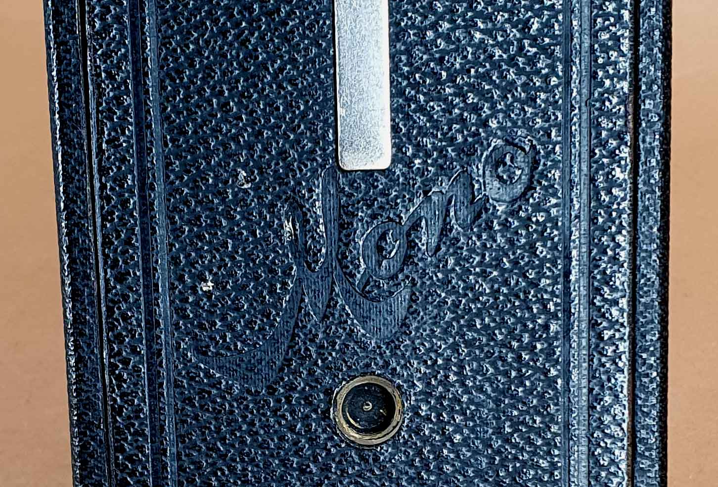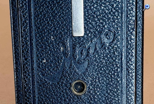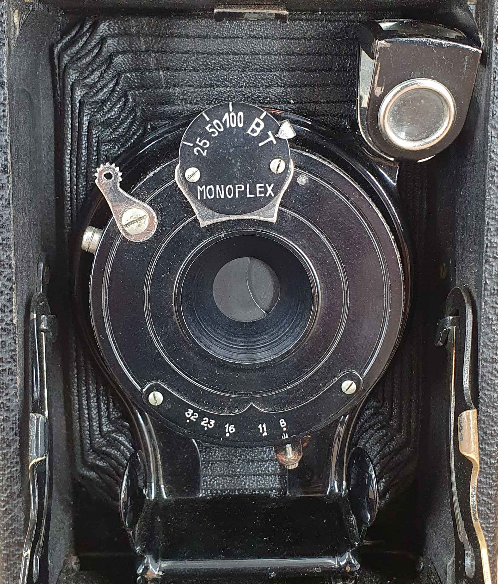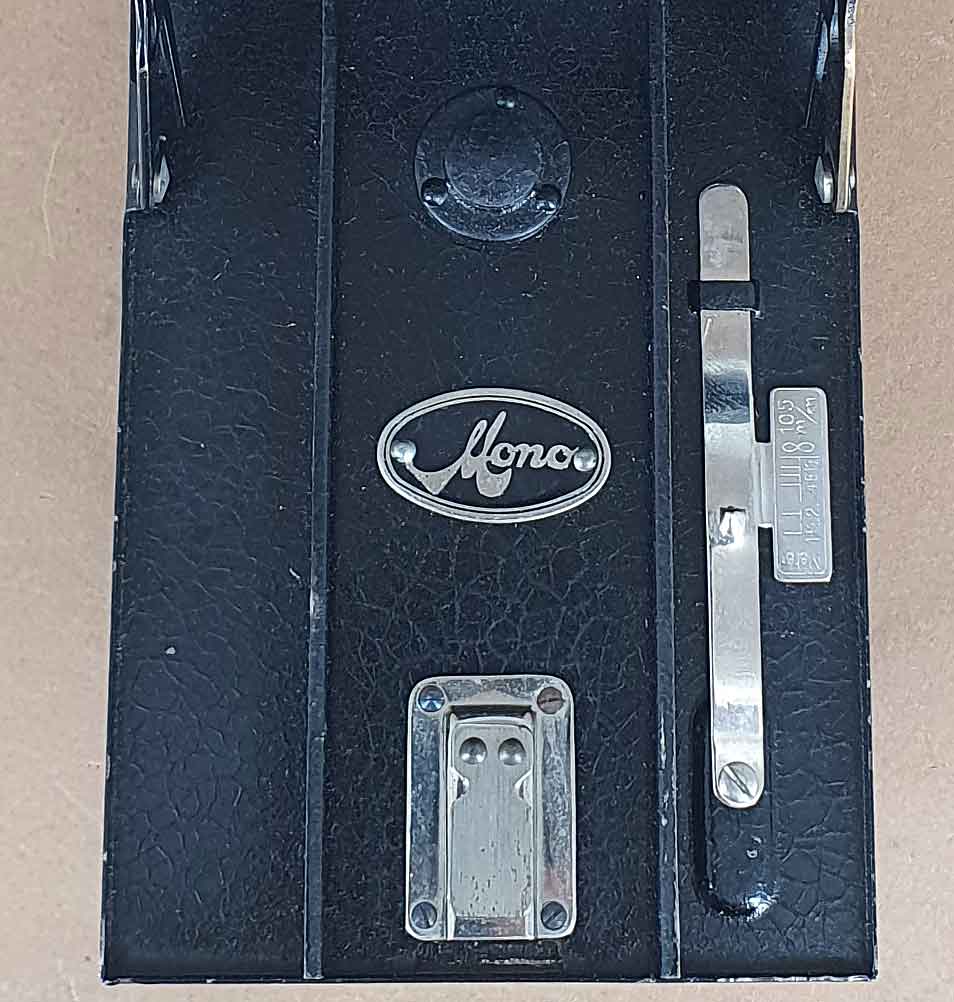 Ich habe die Kamera als Mono-Werk Monoplex eingeordnet, weil dieser Namen auf dem Zeitenrad des Verschlusses zu finden ist. Im WEB findet sich aber kein Nachweis dieses Mono-Werk Kameramodells. Die Bezeichnung „Mono“ findet sich ansonsten noch als Prägung auf der Laufbodenaußenseite und als Schild auf der Laufbodeninnenseite.