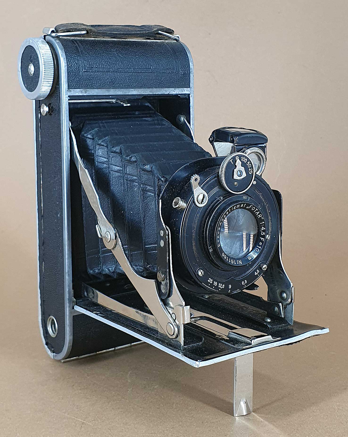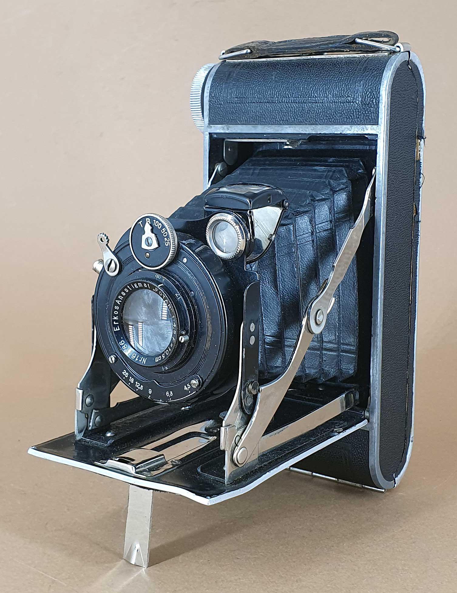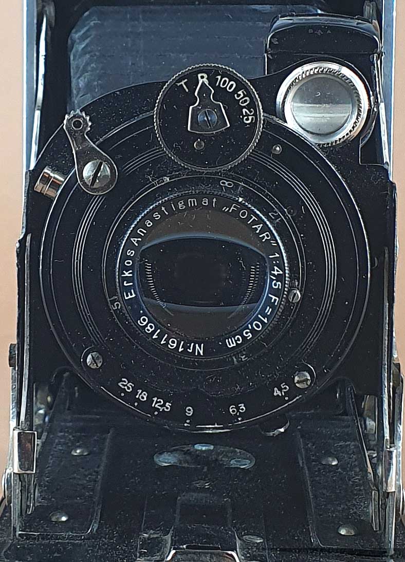 Bestückt ist das vorliegende Exemplar mit einem Erkos-Freital Anastigmat Fotar 4.5/10,5 in einem nicht näher bezeichneten einfachen Zentralverschluss (eventl. von Stein & Binnewerg?). Fokussiert wir über Frontlinsenverstellung (2m bis unendlich).