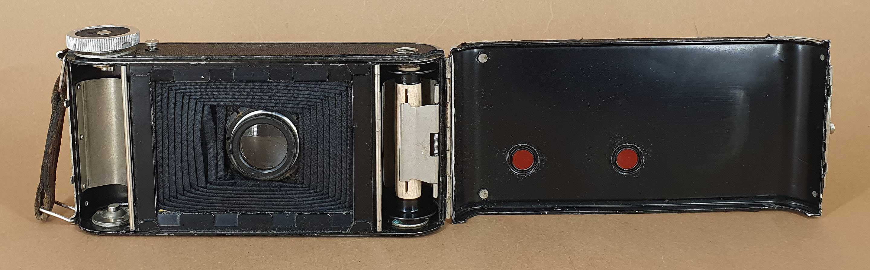 Wie an anderer Stelle schon erwähnt, liegen Informationen zu Kameras von Kolbe & Schulze nur recht spärlich vor. Die hier gezeigte Rollfilmkamera war mir auch gänzlich unbekannt, bis ich sie im Onlineauktionshaus entdeckte. Bereits vor dem ersten Weltkrieg fertigte die Firma neben Reise- und Plattenkameras auch Rollfilmkameras. Von dieser frühen Fertigung sind mir aber nur Katalogabbildungen bekannt. Nach 1930 stieg Kolbe & Schulze erneut in die Produktion von Rollfilmkameras ein, wobei mir mit dem hier gezeigten Exemplar bisher drei verschiedene Modelle bekannt sind. Alle drei Modelle sind recht selten.