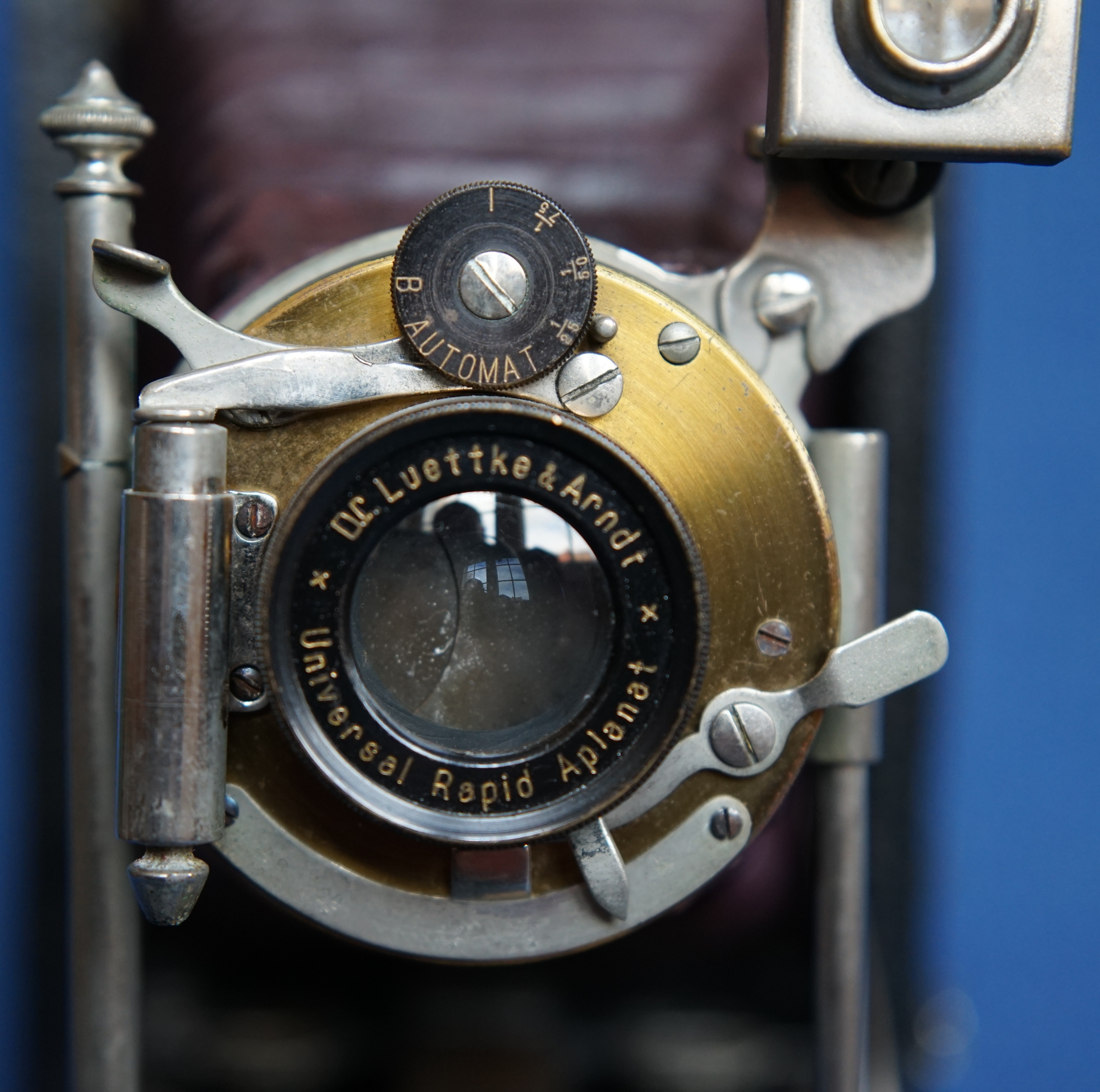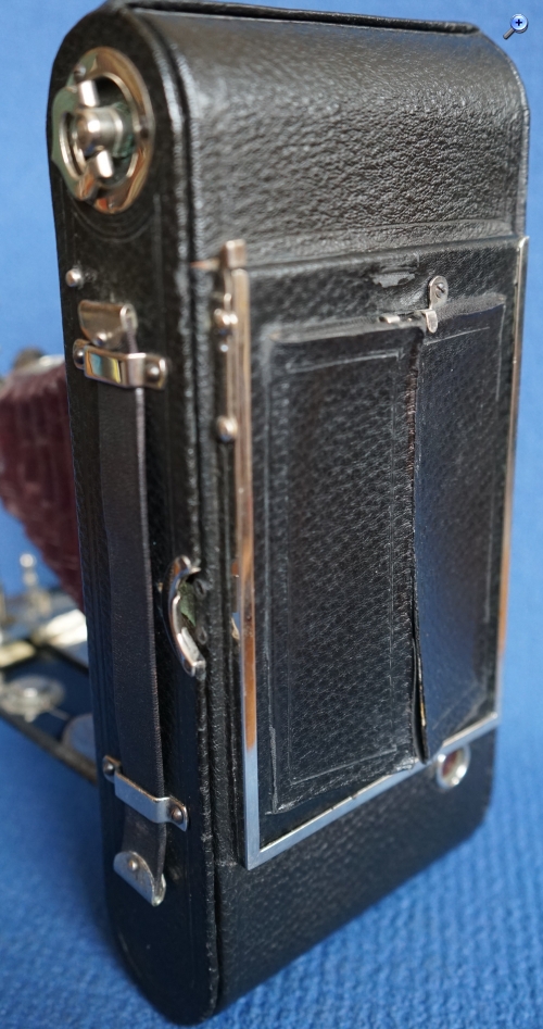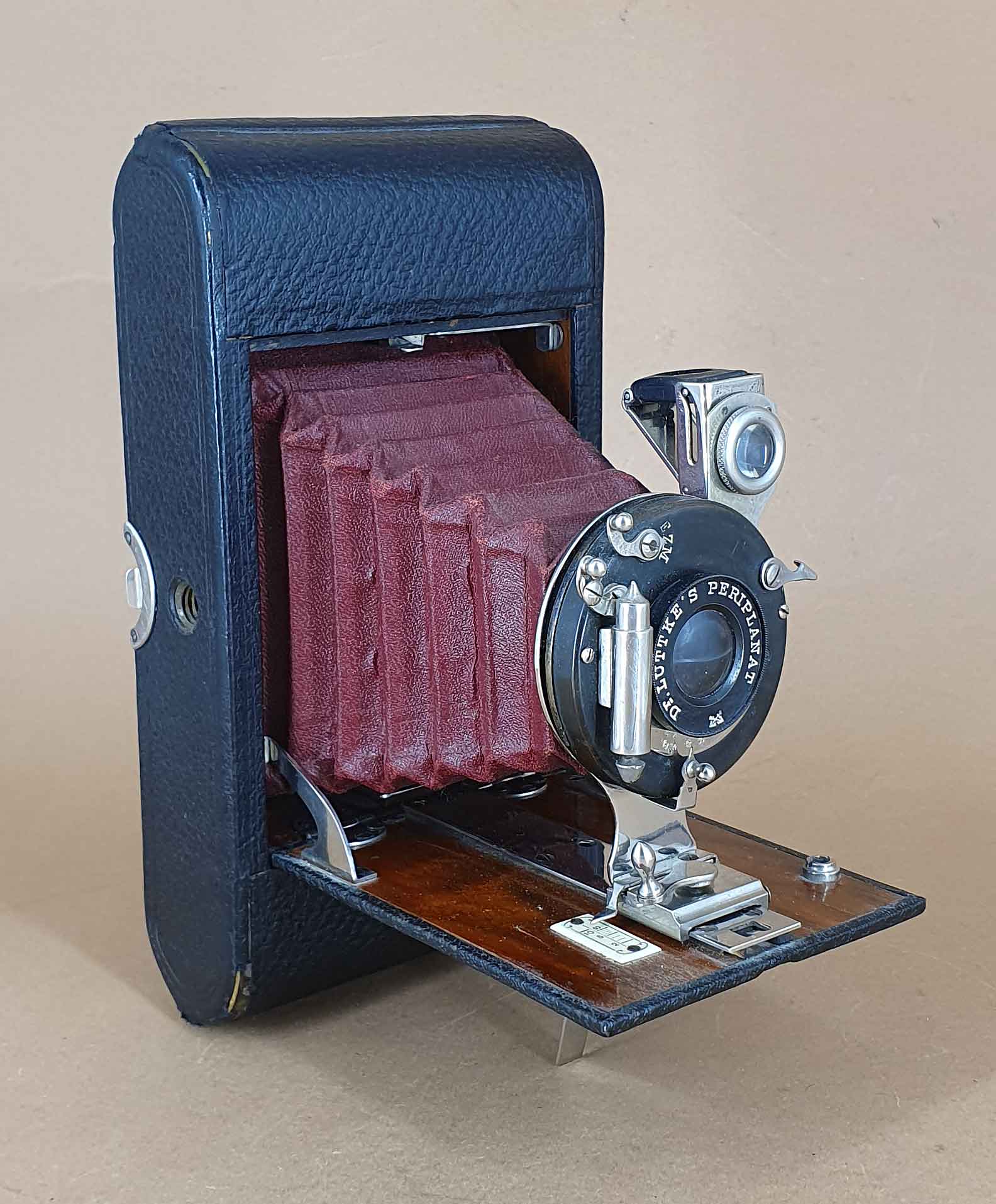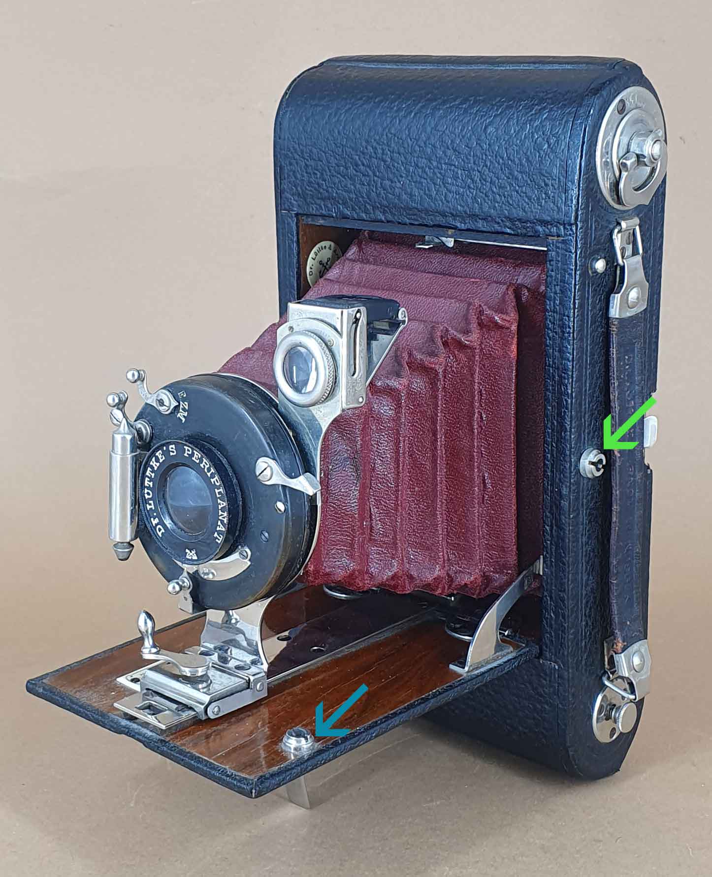 Eine Herstellerplakette im Gehäuseinneren und eine Lederprägung im Griff weisen die Kamera aus Produkt von „Dr. Lüttke & Arndt – Wandsbek“ aus. Die Kamera verfügt weiterhin über zwei Steckfassungen (im folgenden Bild mit Pfeilen markiert), für die ich zunächst keine Funktion zuordnen konnte: