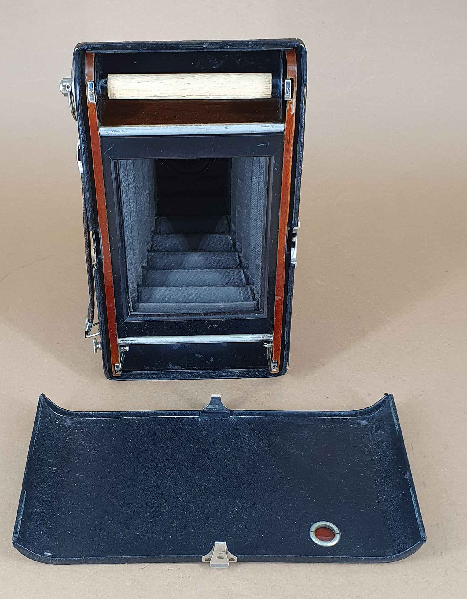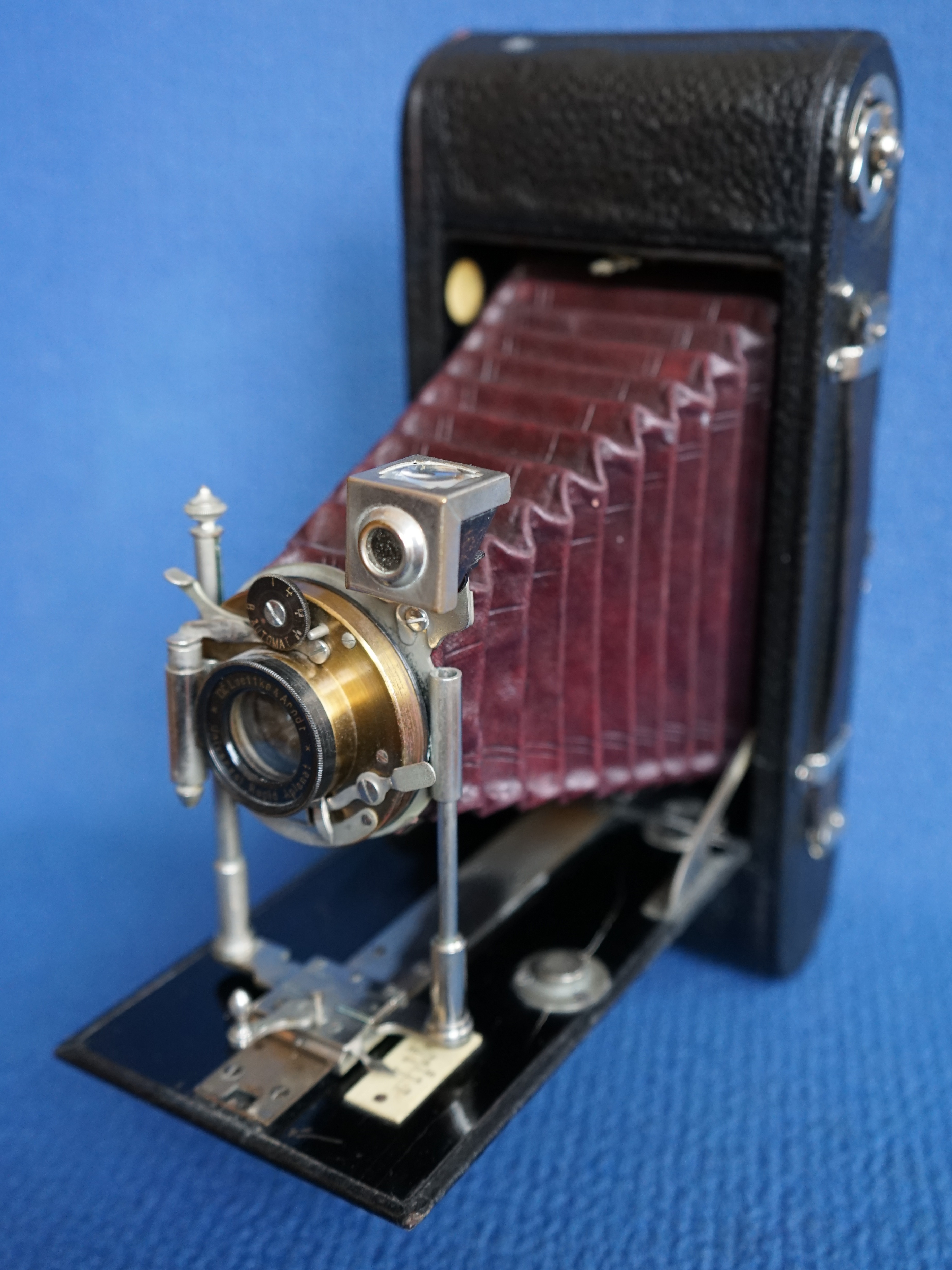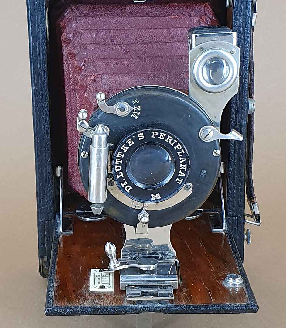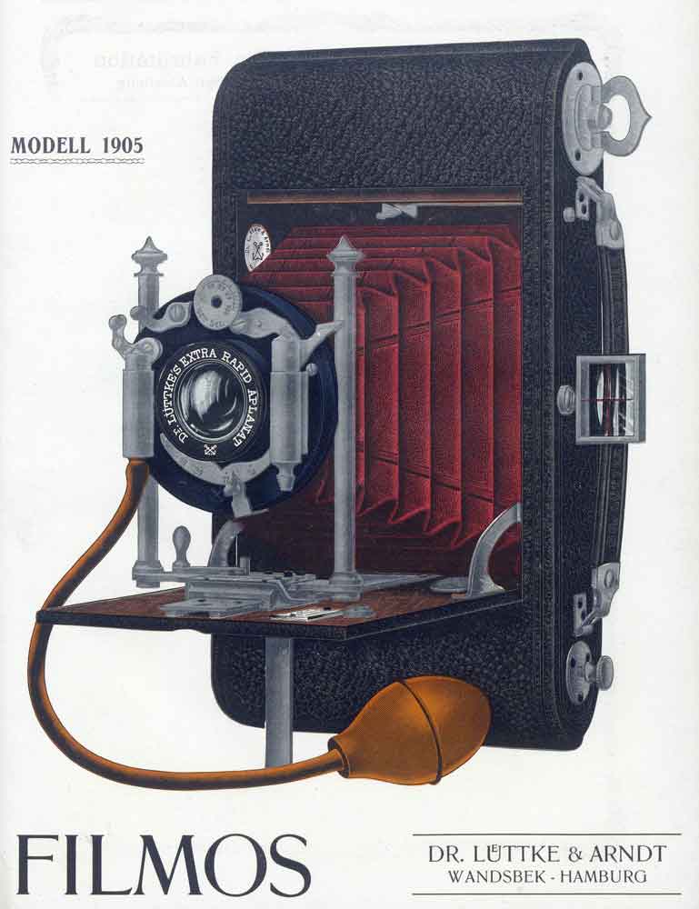 Die Rollfilmkamera Filmos brachte Lüttke & Arndt wohl 1903 heraus und stellte sie bis mindestens 1907 her. Es gab vier Modellvarianten (Filmos I bis IV), wobei unklar ist, in welchen Details sich die Varianten unterschieden. Anhand der im WEB recherchierbaren Filmos Kameras lassen sich aber unterschiedliche Ausstattungsvarianten feststellen: einfacher oder doppelter Auszug, feststehender oder horizontal und vertikal verstellbarer Objektivträger, eingerichtet nur für Rollfilm oder für Platten und Rollfilm. Wenn man annimmt, dass die einfachste Ausstattungsvariante der niedrigsten Nummerierung entspricht, so ist mein Exemplar eine „Filmos I“.