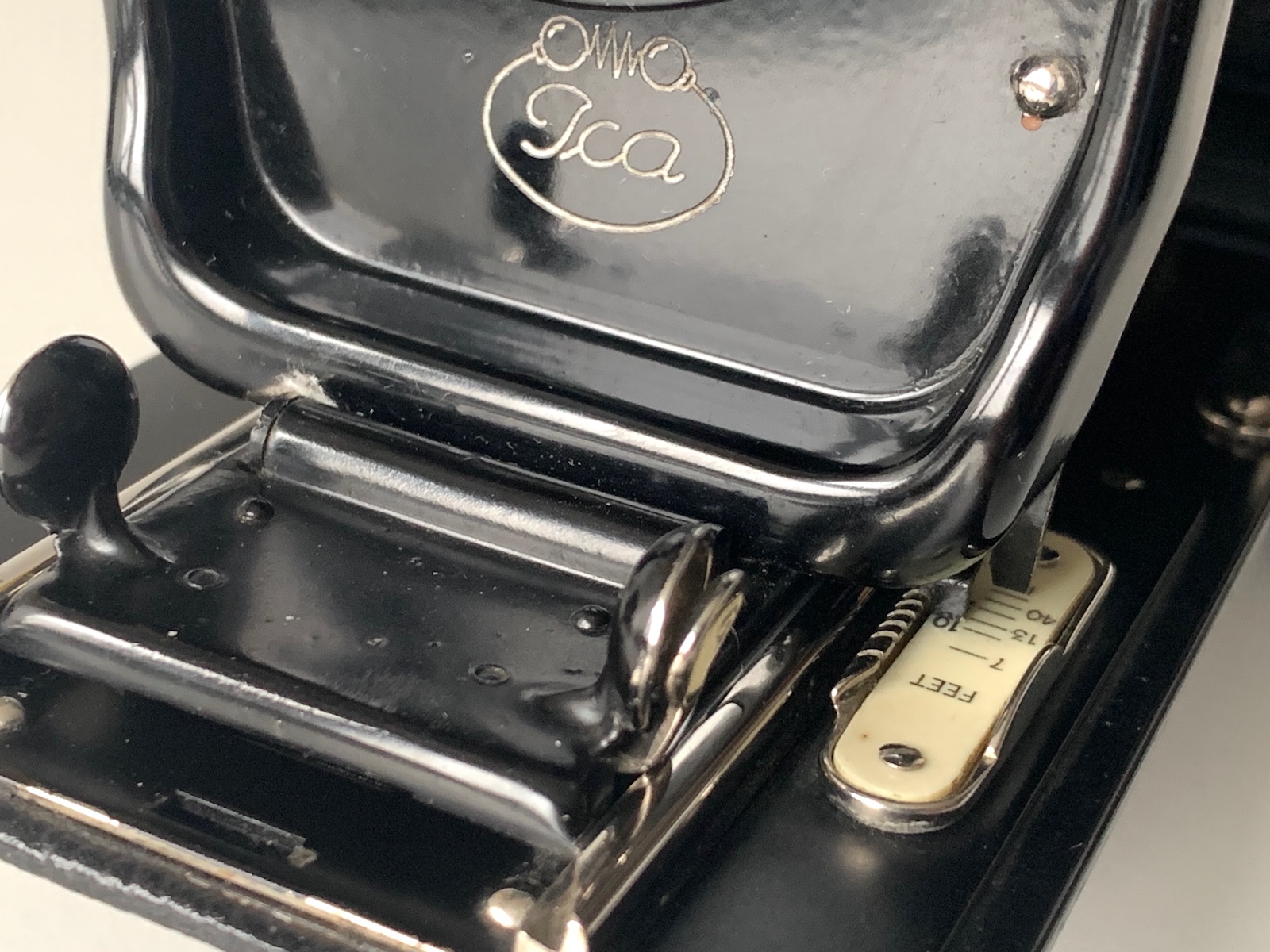 Das vorliegende Exemplar wurde allerdings in Pfund Sterling bezahlt, denn es handelt sich um eine Exportausführung, wie man unschwer an der ft-Skala und am Händlerschild erkennen kann. Die Fa. J[ohn] Lizars (Glasgow) war übrigens nicht nur als Händler, sondern auch als Hersteller tätig; nähere Informationen findet man hier: https://camera-wiki.org/wiki/Lizars .