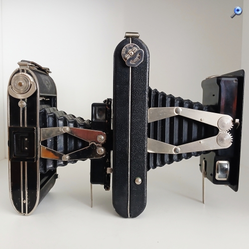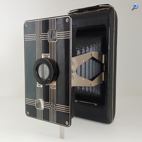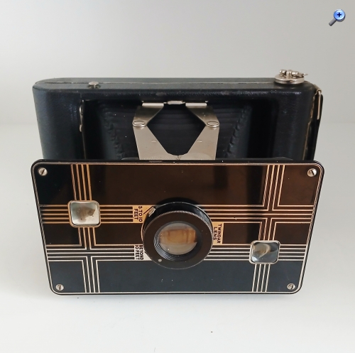 Die Öffnung erfolgt automatisch und entfaltet sich mit voller Geschwindigkeit, daher muss sie vorsichtig geöffnet werden und ist dank robuster seitlicher Arme (strut-folding) einsatzbereit. Die Vorderseite der Kamera ist groß und konzentriert äußerlich die Dekoration vom Typ 'art-decó' und enthält im Inneren das Objektiv und den Verschluss. Sie ist robust und schwer, bleibt aber dank ihres abklappbaren Stützbeins für die vertikale und horizontale Unterstützung fest verankert. Allerdings muss seine Bedienung ziemlich unangenehm gewesen sein, weil es überraschenderweise kein Tripod-Gewinde hat.