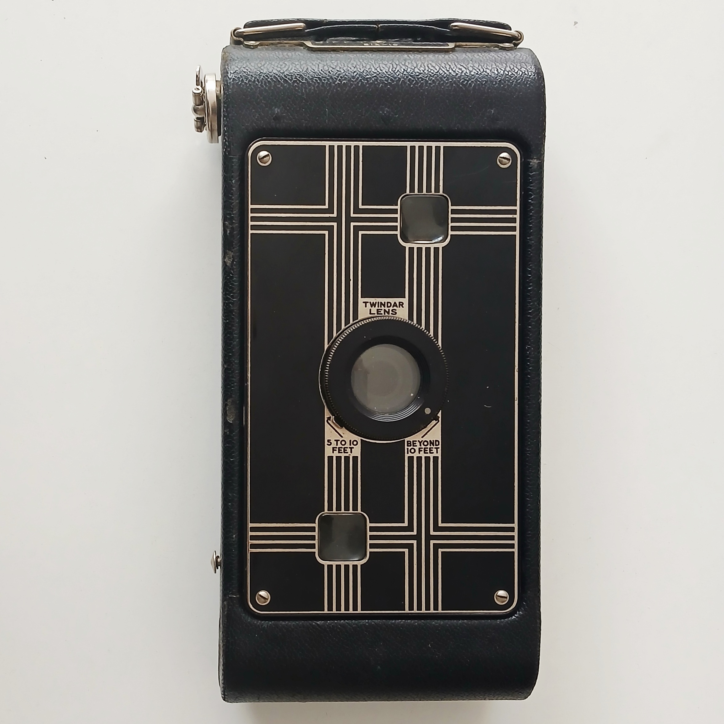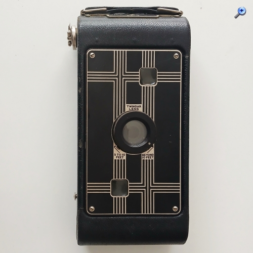 Der Fokus wird erreicht, indem der Objektivring gedreht wird und sehr einfache Einstellbereiche für das Objektiv bietet, wie man es von einer solchen Amateurkamera erwarten würde, die durch eine Skala von 5 oder 10 Fuß und mehr als 10 Fuß begrenzt ist. Eine Auswahltaste im oberen Bereich ermöglicht die Wahl zwischen dem kontinuierlichen Belichtungsmodus T oder einer einzelnen Geschwindigkeit I. Auf der anderen Seite, wo sich die Auslösetaste befindet, gibt es eine ausziehbare Lasche, die drei mögliche Blendenöffnungen (rotierenden Typs) ermöglicht. Die Linsen sind 'Twindar Lens' und würden eine feste Fokusgruppe mit doppelter achromatischer Linse sein. Der Körper ist mit synthetischem Material bedeckt, analog zu dem, das in vielen Kodak-Kameras dieser Zeit verwendet wurde. Der Balg ist auch nicht aus Leder und daher anfälliger für Perforationen. Der hintere Verschluss der Kamera ist sehr empfindlich und muss mit größter Sorgfalt behandelt werden.