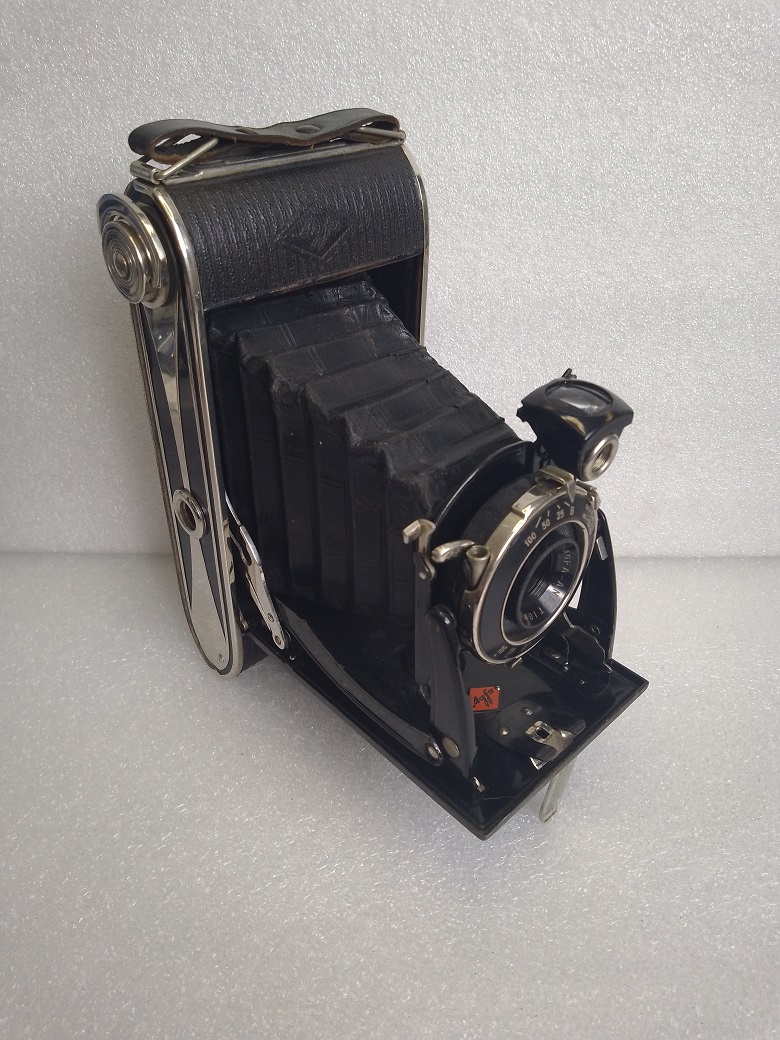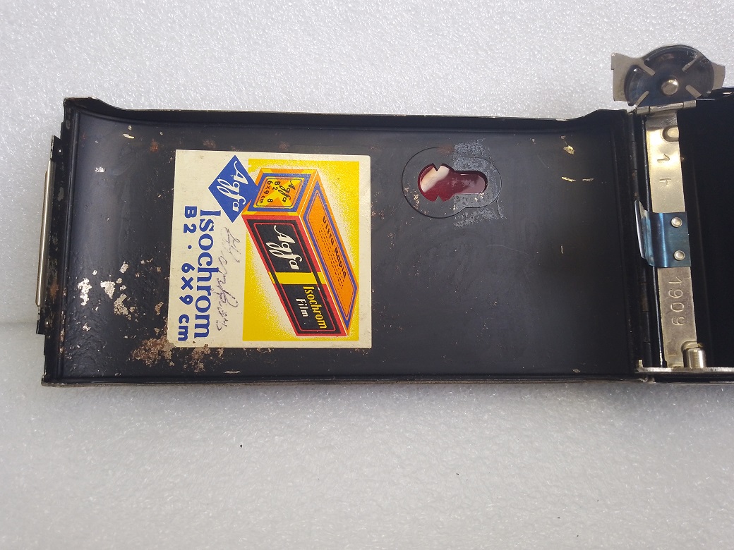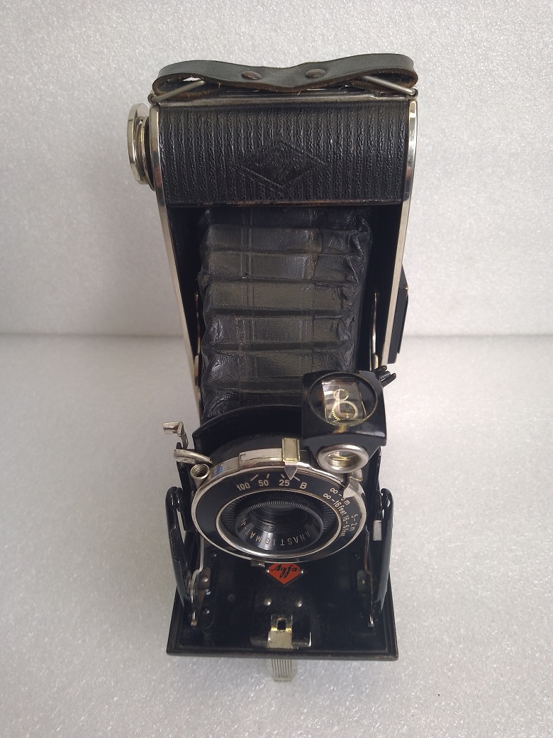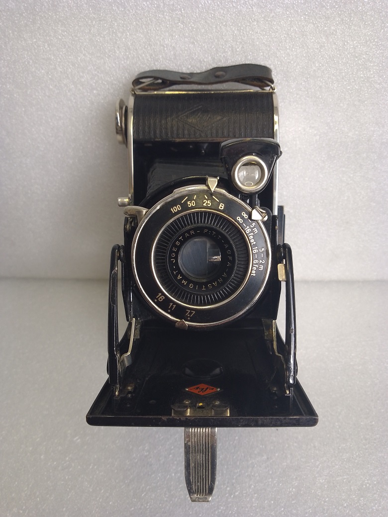 Hersteller: Agfa Kamerawerk München Modell: Billy Record 7,7 Typ: Rollfim (120er bzw. B2) Balgenkamera mit Brillant- und Rahmen/Sportsucher, Format 6x9, max. 8 Aufnahmen Baujahr:1933 Seriennummer: 1F 1909 Verschluß: Agfa Verschluß, "B", 1/25 - 1/100 Sekunde mit Drahtauslöseranschluß Blenden: 7,7, 11 und 16 Objektiv: Agfa Anastigmat Igestar 7,7/10cm Fokussierung: manuell, 2 - 5 Meter (Nahbereich) und 5 Meter bis unendlich (Fernbereich) Gewicht: ca. 515 Gramm Abmessungen: 151x74x31 Neupreis (1933): 24 RM