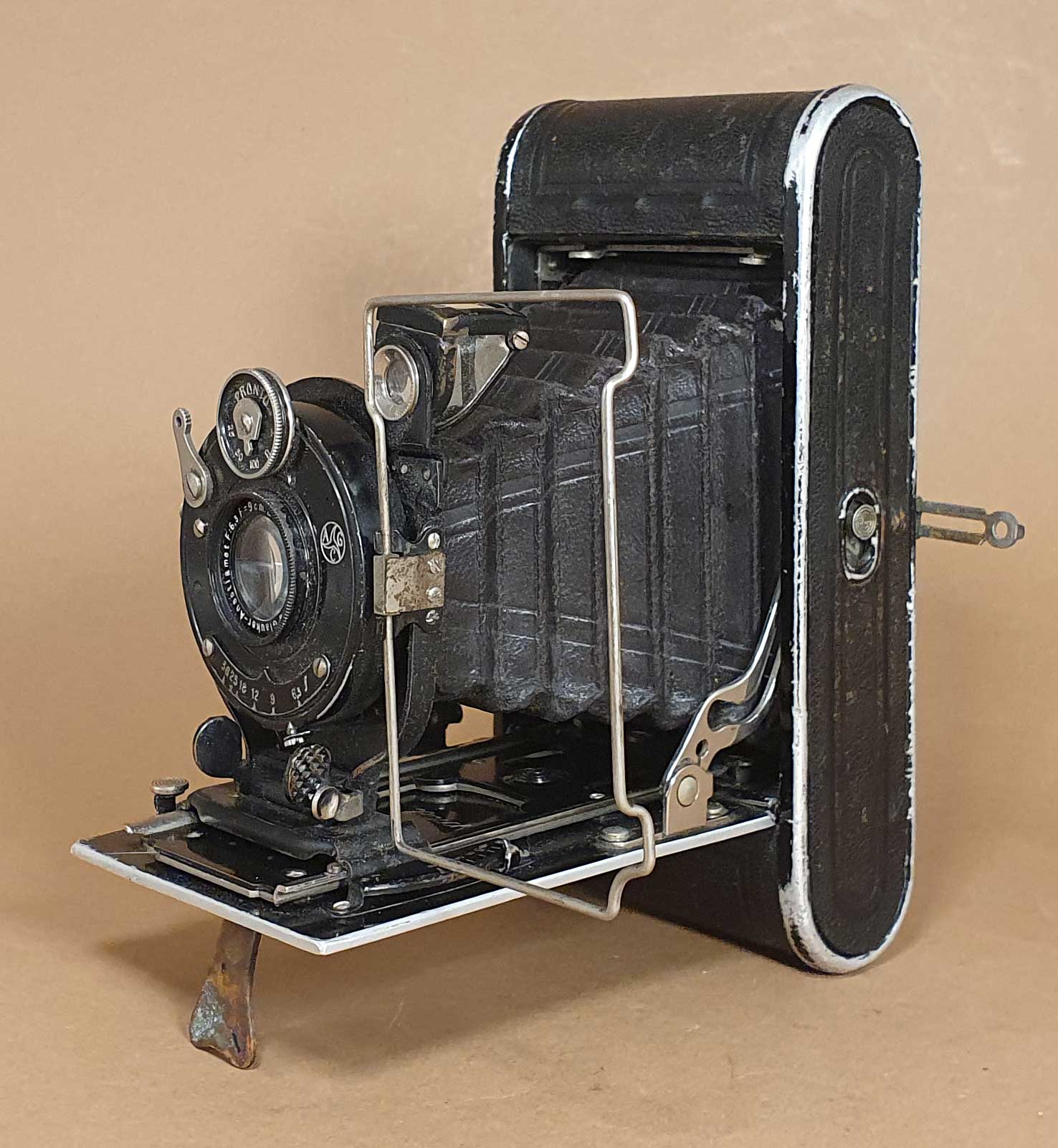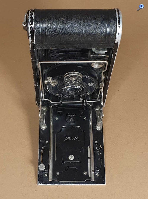 Im WEB finden sich nur sehr wenige Informationen zu diesem Modell von Emil Busch. Auf ‚knippsen.blogspot.com‘ wird die Kamera erwähnt (https://knippsen.blogspot.com/2023/02/) und auf ‚collectiblend.com‘ wird das Format 5x7,5 ebenfalls genannt. Einen zeitgenössischen Hinweis zur Kamera habe ich lediglich in der Zeitschrift „The Amateur Photographer & Cinematographer“ (Band 68, 1929, Seite 137) gefunden. Frei übersetzt kann man daraus folgendes erfahren: „Es ist eine erfrischende Abwechslung, eine neue Rollfilmkamera für ein anderes Format als den allgegenwärtigen 3 ¼ ×2 ¼ -Zoll-Film zu entdecken, und es ist in der Tat erfreulich zu sehen, dass die berühmte Firma Emil Busch versucht, hierzulande das Format zu popularisieren, das sich in kontinentalen Ländern immer größerer Beliebtheit erfreut – den 3×2-Zoll-Film. Zwar gibt es nur einen geringen Unterschied in der Größe der beiden Bilder, aber dieser Unterschied macht die 3×2-Zoll-Kamera deutlich handlicher als ihr größeres Schwestermodell, das 3 ¼ ×2 ¼ -Zoll-Film verwendet. […] Natürlich ist sie gut verarbeitet, wie es in der heutigen Zeit bei Kameras, die mehr als ein paar Schilling kosten, auch sein muss: robust und kompakt. Das Exemplar, das ich in den Ausstellungsräumen der Emil Busch Optical Company (37-38, Hatton Garden, E.C.) begutachtete, zeigte, dass der Designer von Busch Wert auf einfache und handliche Bedienung legt. Die Front war angenehm stabil, der Drahtrahmen-Sucher zusätzlich zum Brillantsucher waren vernünftig konstruiert. Die Rückseite der Kamera lässt sich zum Laden abschieben, sodass das Einlegen des neuen Films besonders einfach und auch für Anfänger problemlos gelingt. Die Fokussiervorrichtung verfügt über einen radialen Hebelmechanismus, der eine schnelle und einfache Justierung ermöglicht. Die Kamera kann wahlweise mit drei Verschlüssen geliefert werden: dem Ebusch (drei Geschwindigkeiten), dem Ibsor oder dem Compur, und entweder mit dem f/4,5 Busch Glaukar oder dem 1/6,3 Glaukar. Die Preise beginnen bei 4 £ […]“.