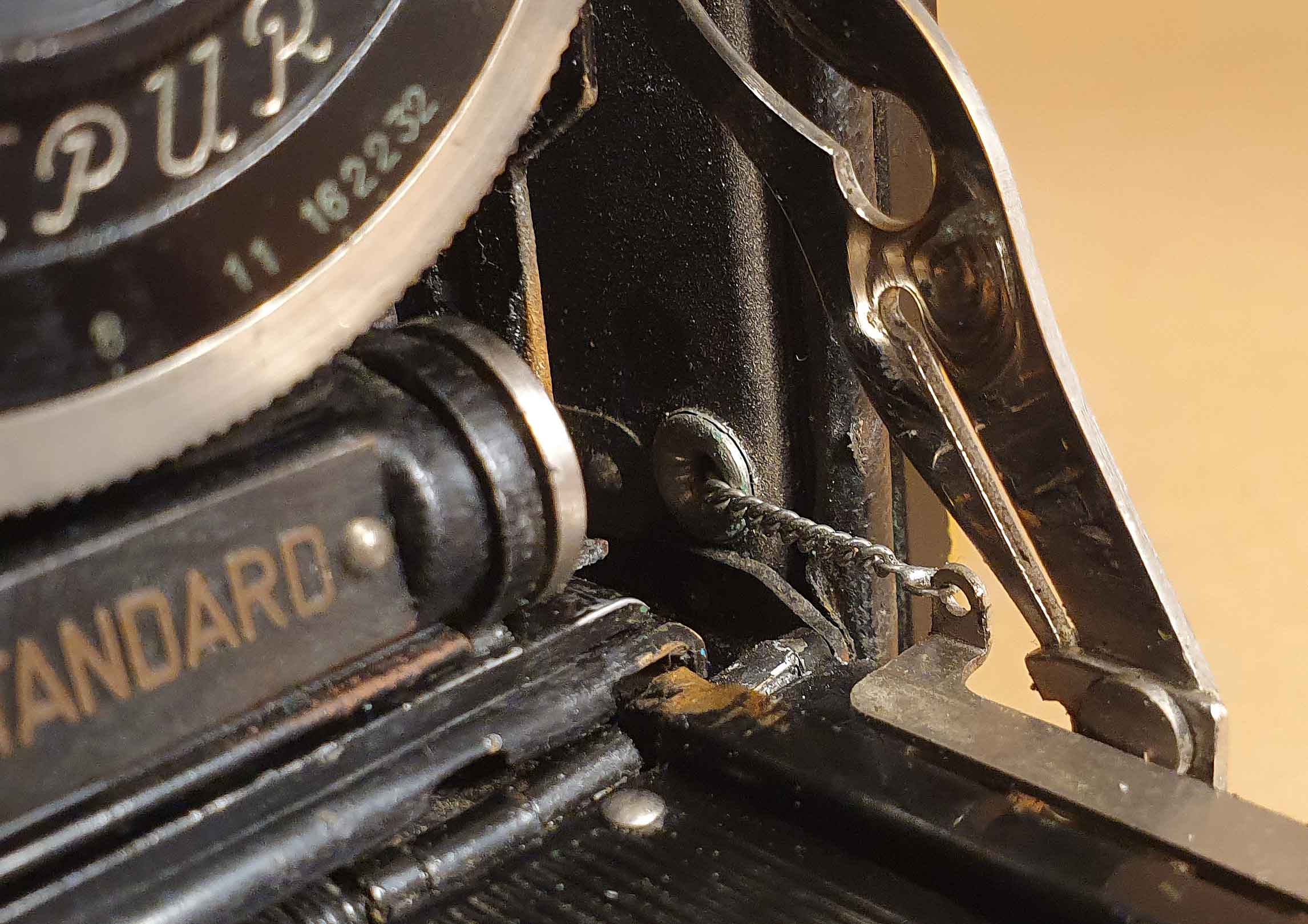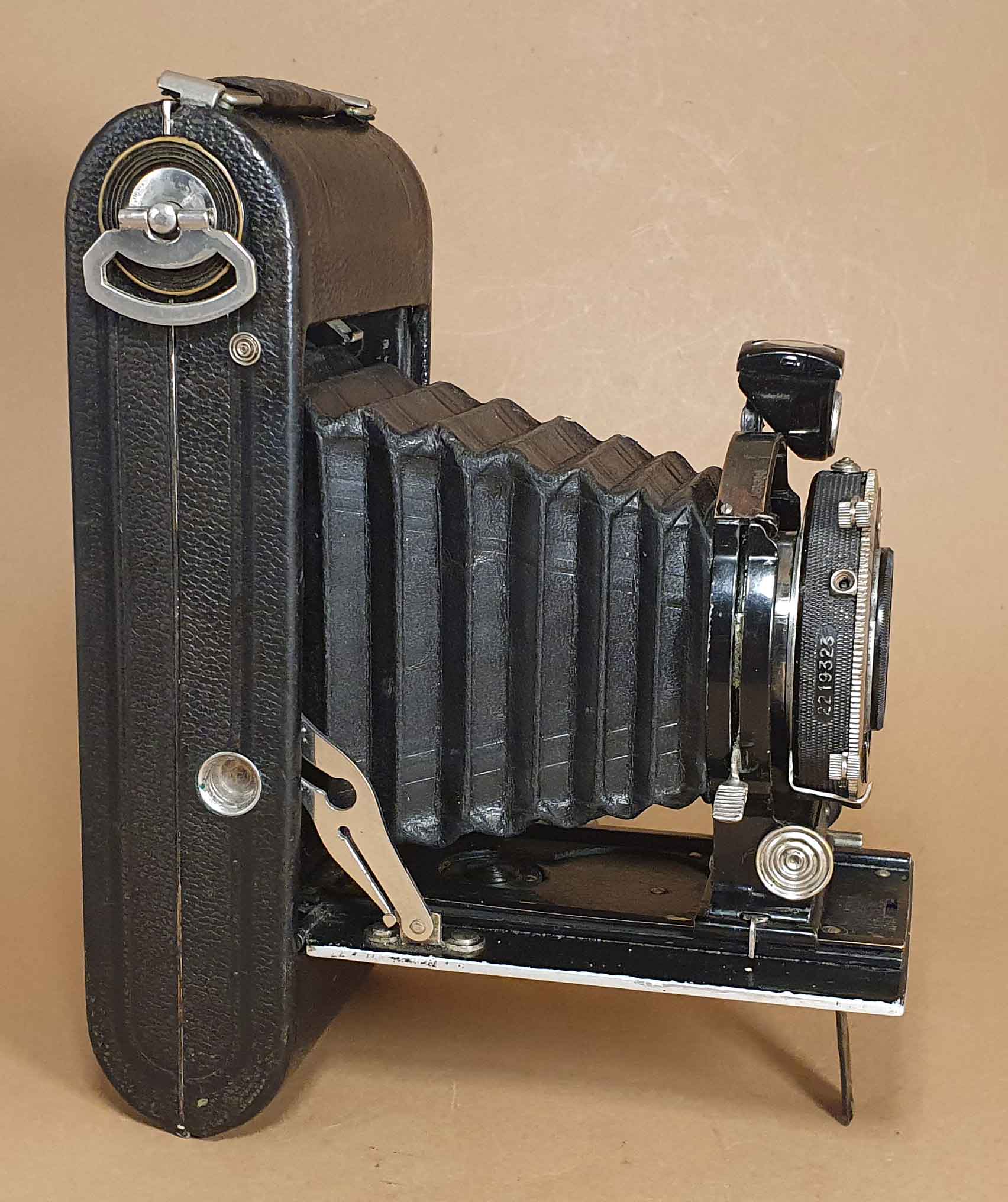 Das Modell Agfa Standard 254 hat der Rainer im Forum bereits vorgestellt (https://blende-und-zeit.sirutor-und-comp...2&thread=18). Den genauen Unterschied der Standard 254 zur hier vorzustellenden Standard 264 habe ich nicht herausgefunden, aber die KI behauptet, dass die 264 über die bessere Optik- und Verschluss-Ausstattung verfügt und ansonsten baugleich ist. Das hier vorzustellende Exemplar verfügt zusätzlich noch über den sogenannten Scharfeinsteller, der erst ab 1930 angeboten wurde und auf den ich weiter unten noch kurz eingehen werde. Die allgemeinen technischen Ausstattungsmerkmale der Kamera kann man bei der Vorstellung von Rainers 254 nachlesen. Bestückt ist meine Kamera mit einem Agfa Trilinear 4.5/10,5 cm im Compur-Verschluss. Das hier gezeigte Exemplar ist auch nicht ganz vollständig (fehlender Drahtrahmensucher) und weist deutliche Gebrauchsspuren auf. Der Fokus saß bei Ankunft der Kamera auch ‚Standard-gemäß' fest, konnte aber durch Erwärmen und anschließendes Entfernen der grünen Schmiere wieder gangbar gemacht werden.