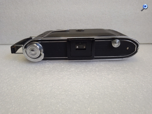 Was als Erstes auffällt wenn man die Kamera betrachtet ist, dass nun Rahmen/Sportsucher und Filmtransportknebel auf einer Ebene liegen. Der Sucher ist also an die bei den bereits vorgestellten Versionen 7,7 und 8,8 Unterseite montiert während das 3/8" Stativgewinde sich nun an der ehemaligen Oberseite befindet. Weiterhin springt der Auslöseknopf für den Gehäuseauslöser in´s Auge. Auf der Rückseite findet sich schließlich eine weitere Variante der Rotfensterabdeckung mittels eines Schiebers in der Rückwand.