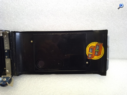 Rückseite: klappbare Rückwand mit Filmandruckplatte, mittels Schieber verschließbares Rotfenster