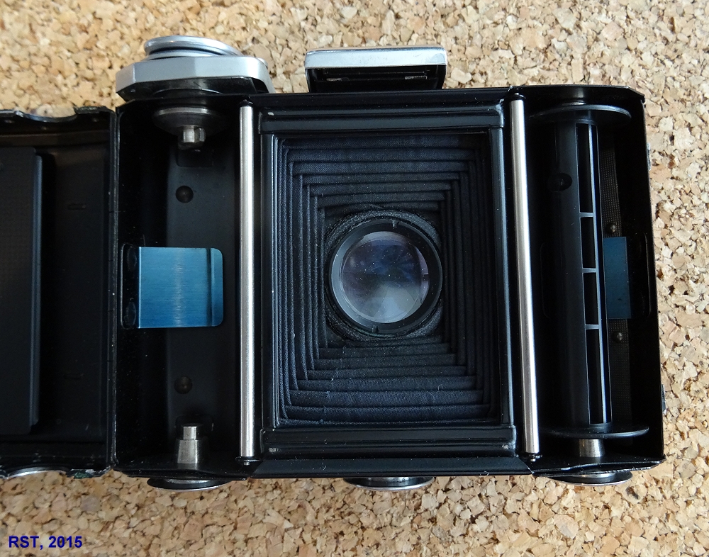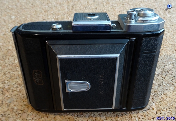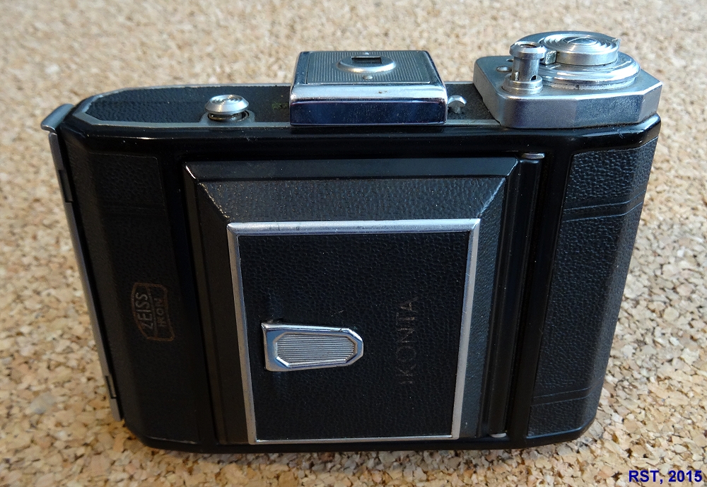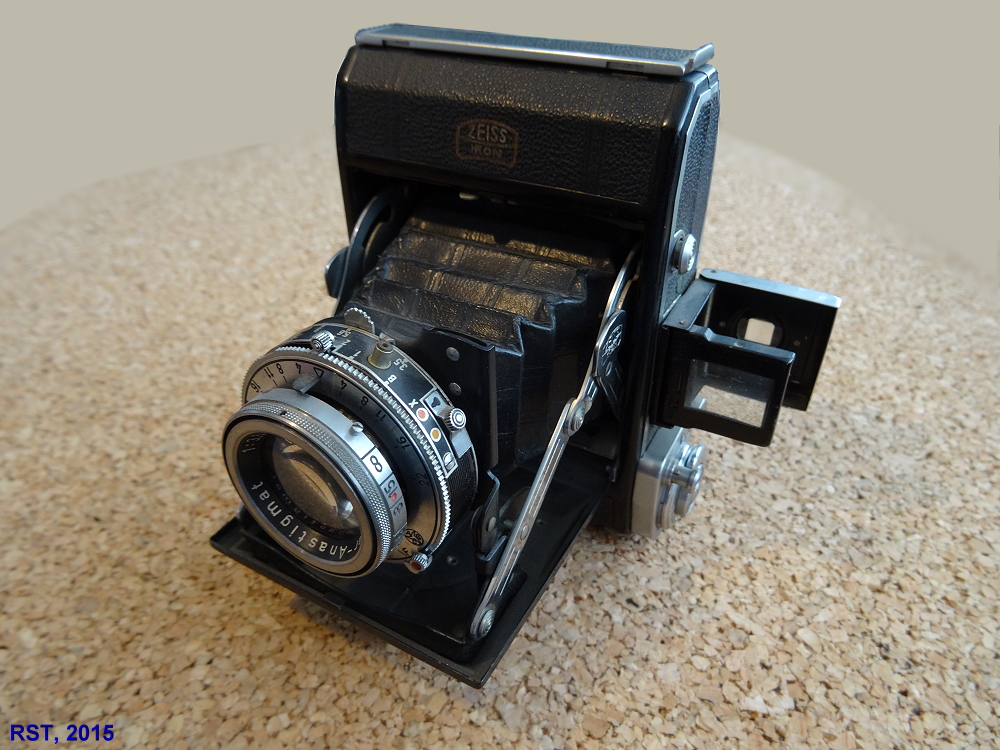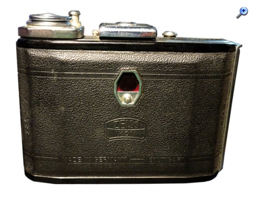 eine teil-verchromte Klappbalgenkamera als Nachkriegsversion aus Stuttgart. Der Balgen mit der Objektiveinheit springt nach Knopfdruck eigenständig heraus.
