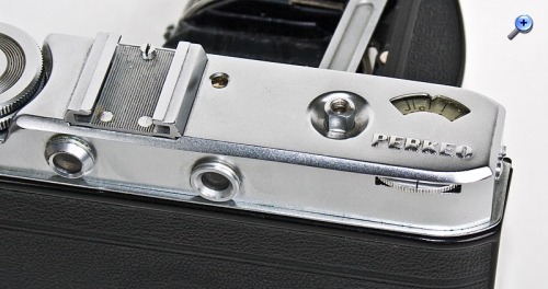 Der Entfernungsmesser ist nicht mit dem Objektiv gekuppelt. Der Suchereinblick befindet sich links, der für den Entfernungsmesser rechts. Der kleine Pfeil im Sichtfenster neben dem Blitzschuh gehört zur Doppelbelichtungssperre: weist er nach links, muss der Film transportiert werden, weist er nach rechts kann der Auslöser gedrückt werden.