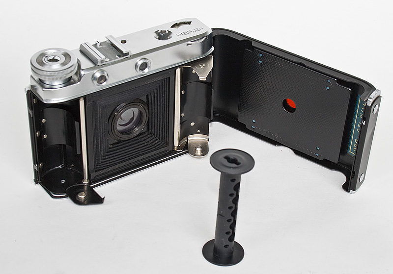 Zum Filmeinlegen werden die beiden Spulenträger ausgeschwenkt. In der Rückwand ist das rote Fenster zum Erkennen der auf dem Film-Schutzpapier aufgedruckten Bildnummern zu sehen. Das Bildzählwerk des Vorgängermodells (II) wurd aus Platzgründen nicht übernommen.