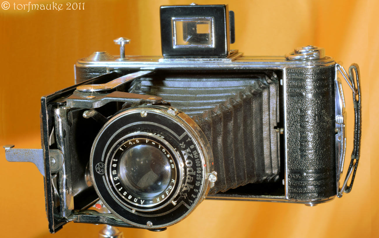 Ich habe für den Anfang eine Kodak Junior für Eure "Vitrine": Es handelt sich um eine alte Rollfilm-Klappkamera mit Balgenauszug und fest montierter Optik und wurde von der Kodak AG, Dr.-Nagel-Werk, Stuttgart, im Zeitraum von 1933 bis 1939 als Junior 620 produziert und für 20 Reichsmark verkauft. Sie war mit einem für die damalige Zeit bereits lichtstarken Anastigmaten mit 10,5 cm (105 mm) Brennweite und einer maximalen Blendenöffnung von f:4,5 ausgestattet und konnte stufenlos bis f:32 abgeblendet werden. Der Zentralverschluss der Kamera wurde von der Fa. Alfred Gauthier, Feinmechanische Werkstatt, Calmbach beigesteuert und konnte die Zeiten von 1 - 1/150el Sekunden in 8 Stufen sowie sowie Dauerbelichtung (B = offen solange Verschluss gedrückt + T = offen, bis der Auslöser erneut gedrückt) auslösen. Bestückt wurde die Kamera mit Rollfilm des Typ 620 für Aufnahmen in 60 x 90 mm, der zwar identisch mir dem Typ 120 ist, aber auf dünneren Rollen mit gleichzeitig dünneren Führungsscheiben aufgewickelt war. Leider wird dieser Typ nicht mehr hergestellt, so das man entweder auf's Fotografieren verzichten oder sich selber Meterware oder von 120er Spulen entnommenen Rollfilm auf die 620er Spulen aufwickeln muß.