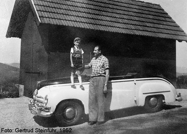 Foto, aufgenommen mit der hier gezeigten Kamera von meiner Mutter 1952 im Schwarzwald am Hotel Unterstmatt: Ich bin die kleine Person auf dem Foto :-) Das Auto ist ein zum Cabriolet umgebauter Ford-Taunus von 1951. Modifiziert und handgefertigt in Berlin Spandau. Es gab in Berlin nur zwei Exemplare.