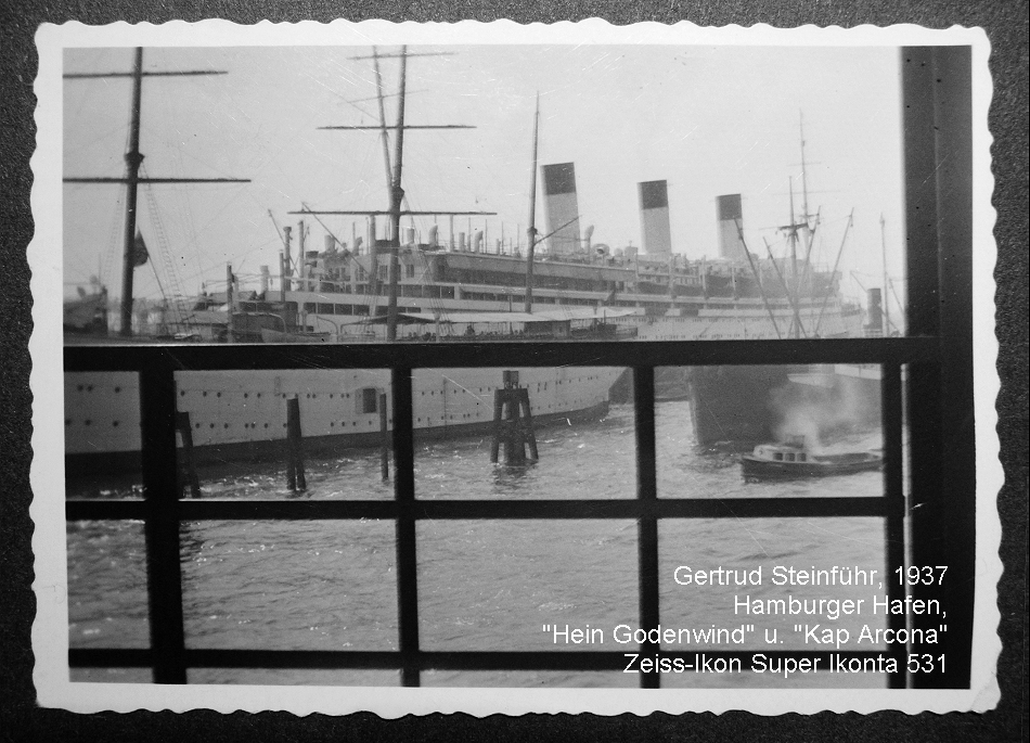 ich habe noch ein Papierbild, aufgenommen mit der Super-Ikonta 531 gefunden. Das SW-Photo von 1937 zeigt im Hamburger Hafen die beiden Schiffe "Hein Godenwind" und "Kap Arcona". Die "Kap Arcona" wurde später 1945 von britischen Bombern in der Ostsee versenkt.