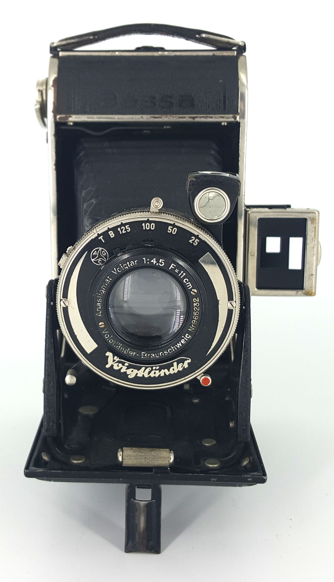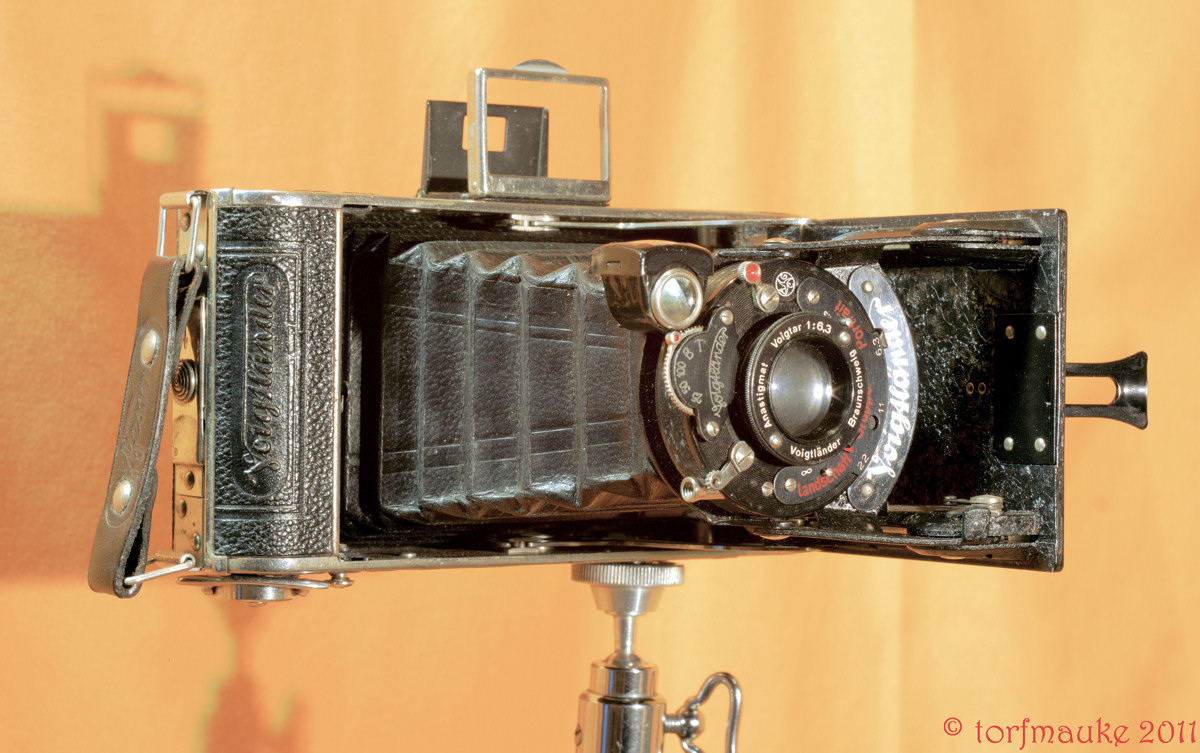 1937-1942 Sucherkamera Rollfilm 120/620/B2 Aufnahmeformat 6 x 9 cm Manualfokus Mechanischer Zentralverschluß Manuelle Belichtungssteuerung Voigtar 75mm/f3,5 Voigtar 75mm/f4,5 Voigtar 75mm/f6,3 Voigtar 75mm/f7,7 165 x 40 x 85 mm 640 g Literatur