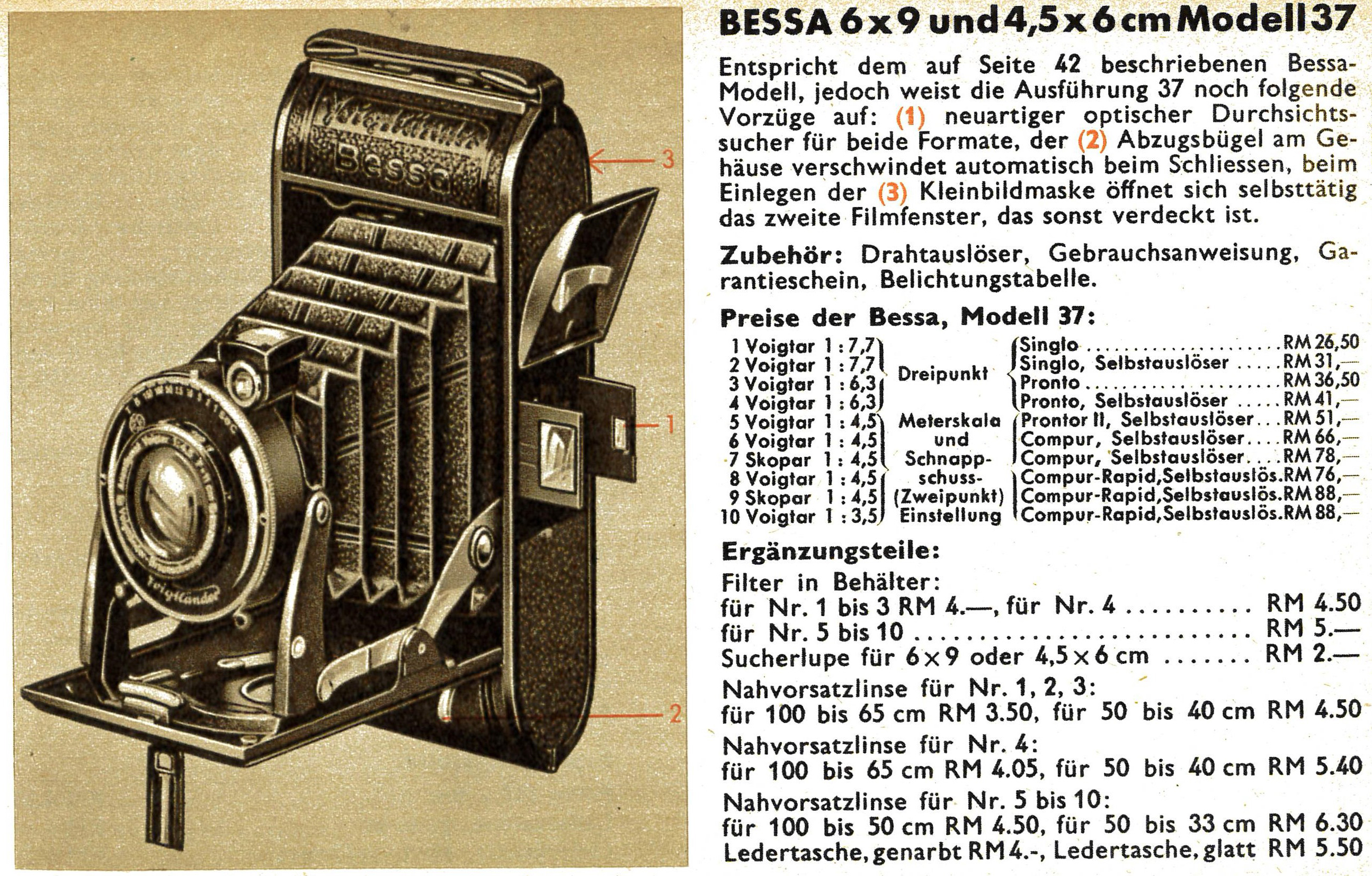 Eine zuverlässige Zweiformat-Kamera (6x9 und 6x4,5) mit der bewährten Voigtländer Optik. Stabiles Metallgehäuse. Brillant- und optischer Zweiformat-Sucher, durch einen Deckel verschließbar, automatische Anzeige des Bildformats, zeigt an, ob man die Kleinbildmaske eingesetzt hat oder nicht. Der Schnellschuss-Auslöser verschwindet selbsttätig im Laufboden beim Schließen der Kamera. Neue Bessa mit: Voigtar 1:7,7 Singlo-Verschluss 1/25, 1/75, B, T ... RM 26.50 Voigtar 1:7,7 Singlo-Verschluss mit Selbstauslöser ... RM 31.- Voigtar 1:6,3 Pronto 1/25-1/125, B, T ... RM 36.50 Voigtar 1:6,3 Pronto mit Selbstauslöser 1/25-1/125, B, T ... RM 41.- Voigtar 1:4,5 Prontor il mit Selbstauslöser 1-1/150, B, T ... RM 51.- Voigtar 1:4,5 Compur mit Selbstauslöser ... RM 66.- Skopar 1 :4,5 Compur mit Selbstauslöser .... RM 78.- Voigtar 1:3,5 Compur mit Selbstauslöser ... RM 88.- Mehrpreis für Compur-Rapid ... RM 10.- (Katalog von 1938)
