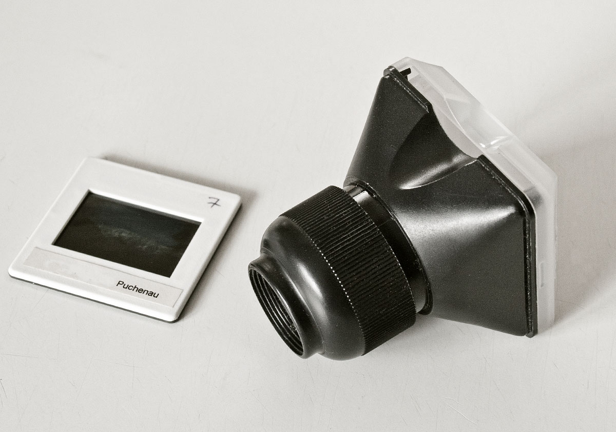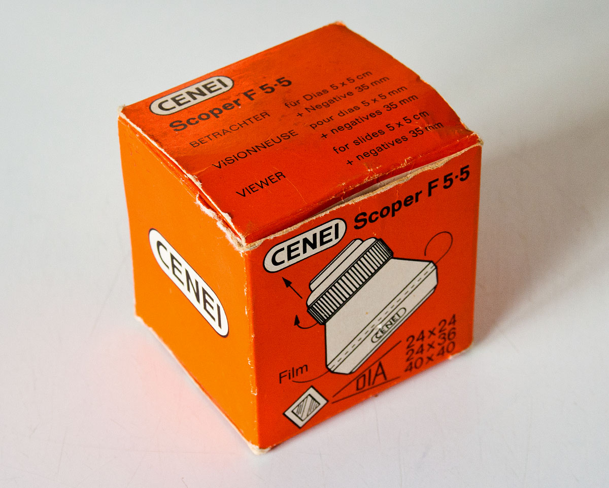 Hersteller: CENEI Carl Neithold, Frankfurt Modell: Cenei Scoper F 5.5 Filmformat: KB Dias gerahmt und 35 mm Filmstreifen Beleuchtung: Keine - Umgebungslicht Scharfeinstellung: Lupe mit Schneckengang Vergrößerung: ca. 3x Abmessungen: 60x60x70 mm Gewicht: 35 Gramm