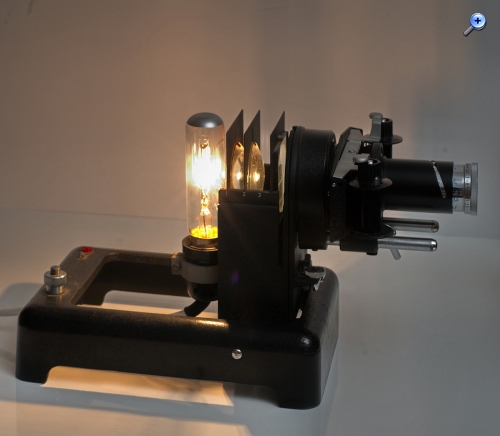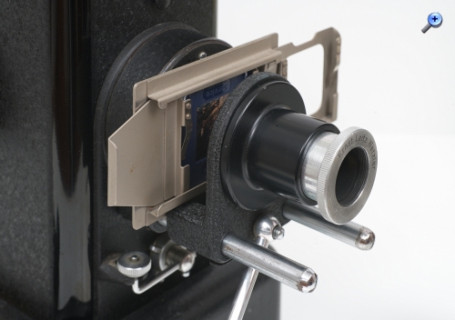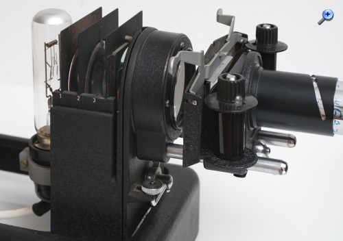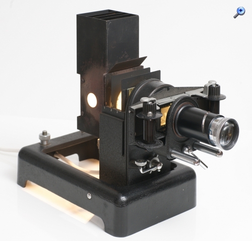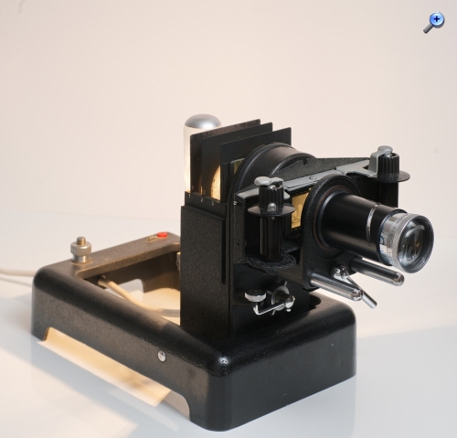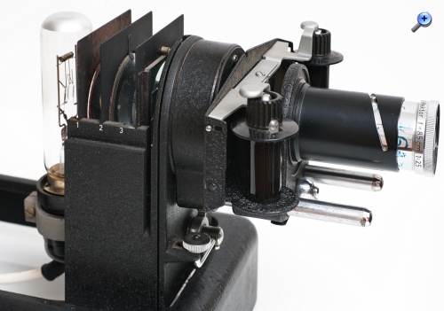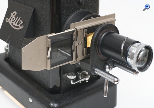 Besonderheiten: Filmbühne drehbar; Platz für zweites Wärmeschutzglas; Lampenzentrierung von außen; Neigung verstellbar mit Stellschraube; abnehmbares Gehäuse, alle Teile leicht zugänglich; Mikro Ansatz mit Summar 1:2 / 24 mm Objektiv