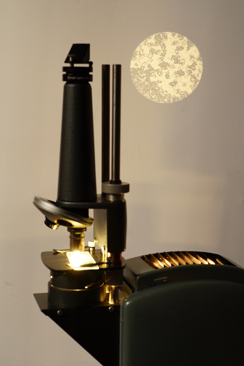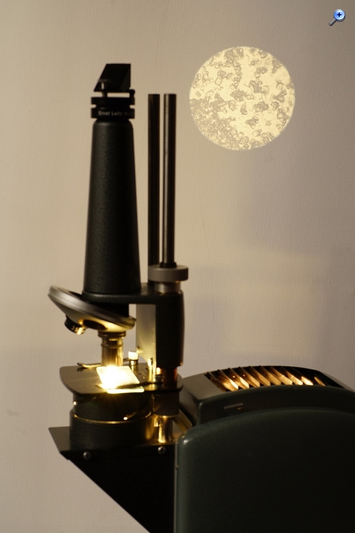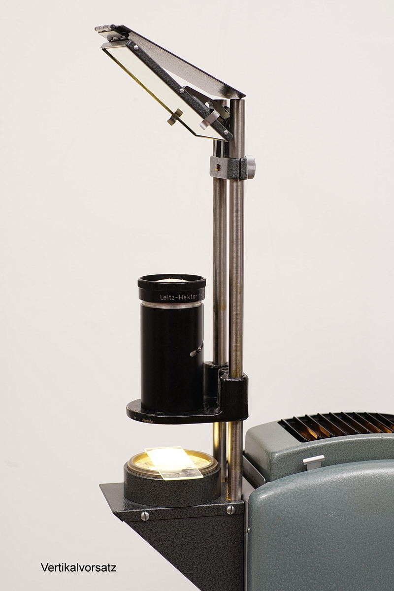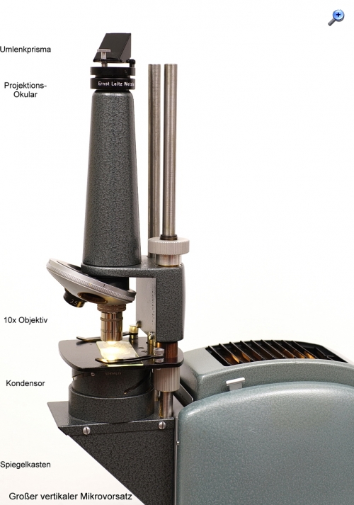 Großer vertikaler Mikrovorsatz für die Projektion von fließenden oder zerlaufenden Objekten bei Abbildungsmaßstäben bis 1400:1 auf dem Bildschirm. Durch Umschalten des Objektivrevolvers ist die Wiedergabe des Bildes in vier abgestuften Vergrößerungen möglich. Bestehend aus Spiegelgehäuse, Stangenteil und Umlenkspiegel oder Prisma, Mikroskopträger mit Feststellvorrichtung, verstellbarer Kondensorlinse, Objekttisch und Präparateklammern, Mikroskoptubus sowie Objektivrevolver mit 3 bis 4 Objektiven, Projektionsokular.