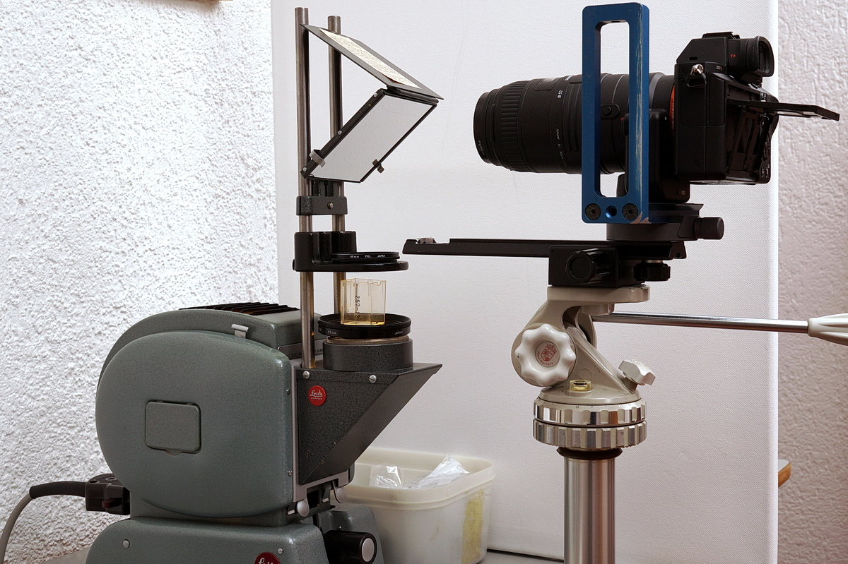 Vertikalvorsatz für die Übersichtsprojektion von flüssigen oder zerlaufenden Objekten bei Abbildungsmaßstäben bis etwa 120:1 auf dem Bildschirm. Diesen Vertikalvorsatz habe ich zusammengestellt aus Teilen des „Großen vertikalen Mikrovorsatzes“ und passenden vorhandenen Kondensoren und Objektiven der Projektoren VIIIa oder Prado.