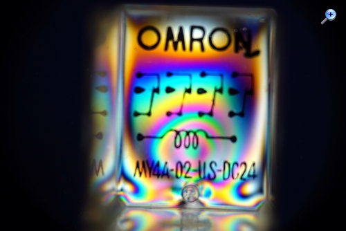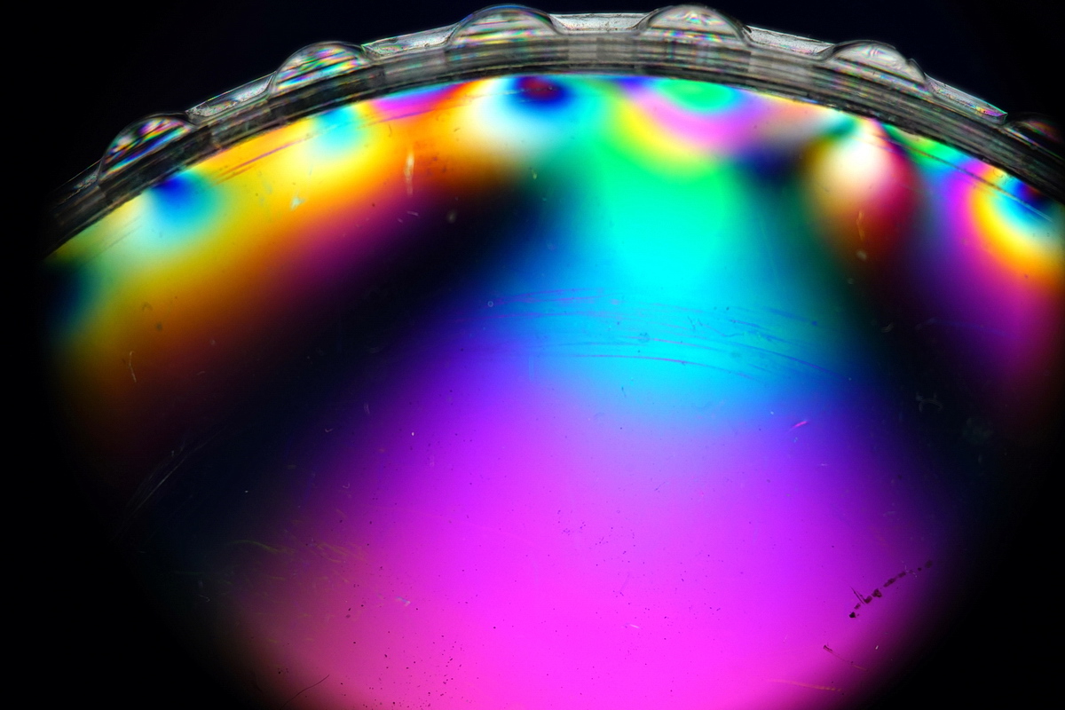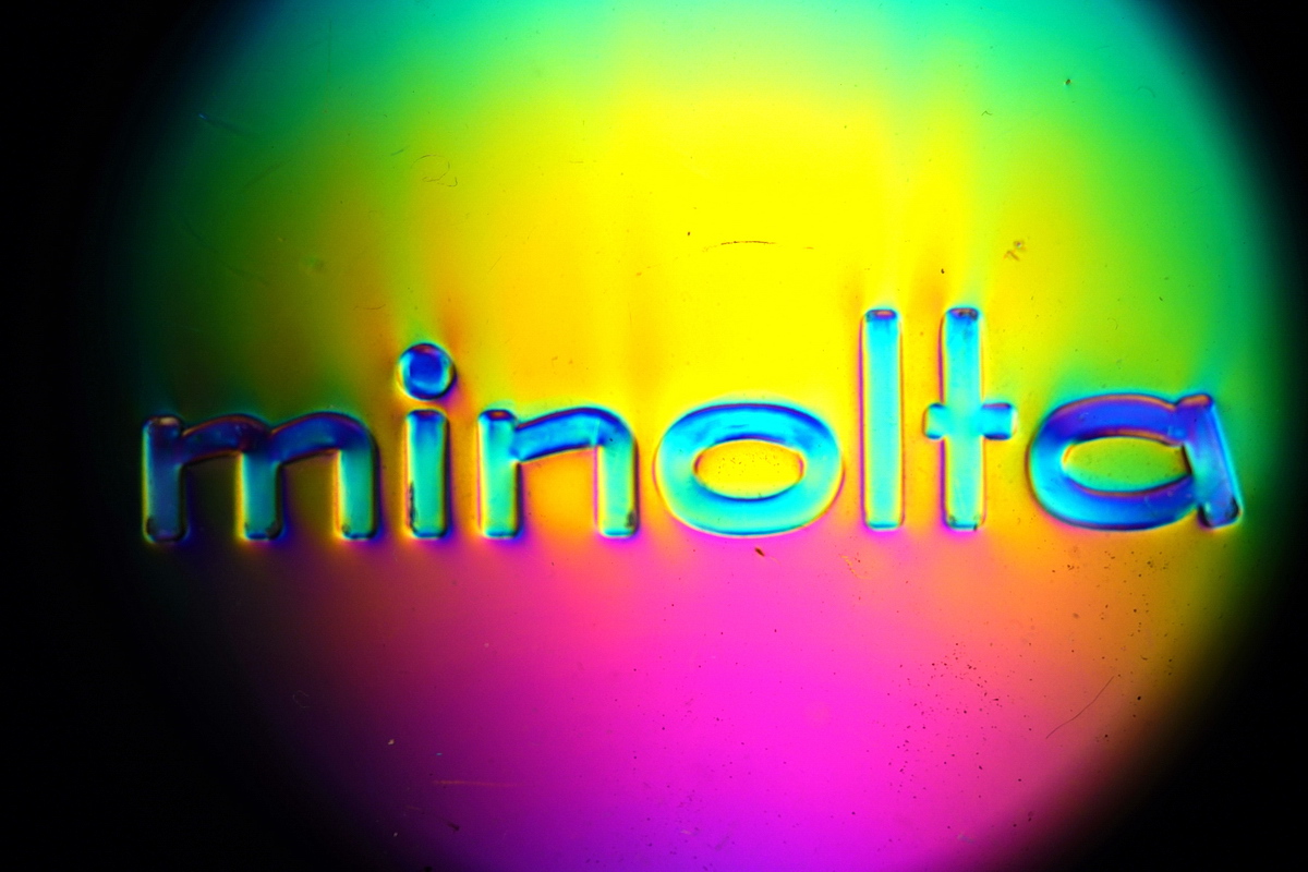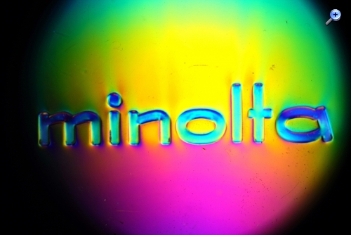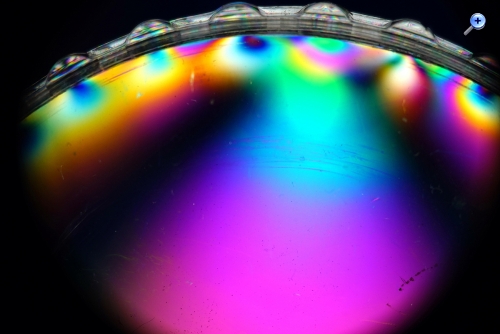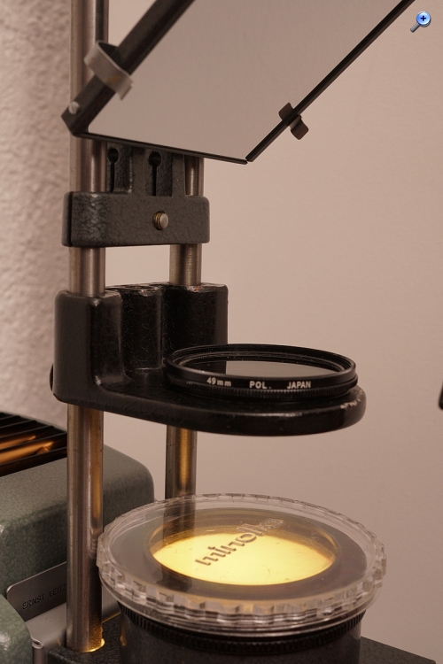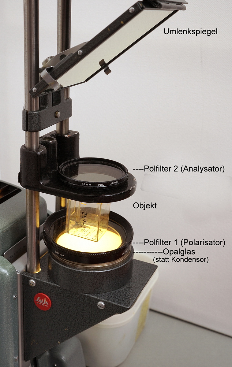 Nimmt man 2 lineare Polfilter hinzu, kann man mit diesen spannungsoptische Experimente machen. Zur Demonstration habe ich den Kondensor durch eine Opalglasscheibe ersetzt, das Objektiv entfernt und mit einem Makroobjektiv über den oberen Umlenkspiegel bei „gekreuzten Polfiltern“ fotografiert.