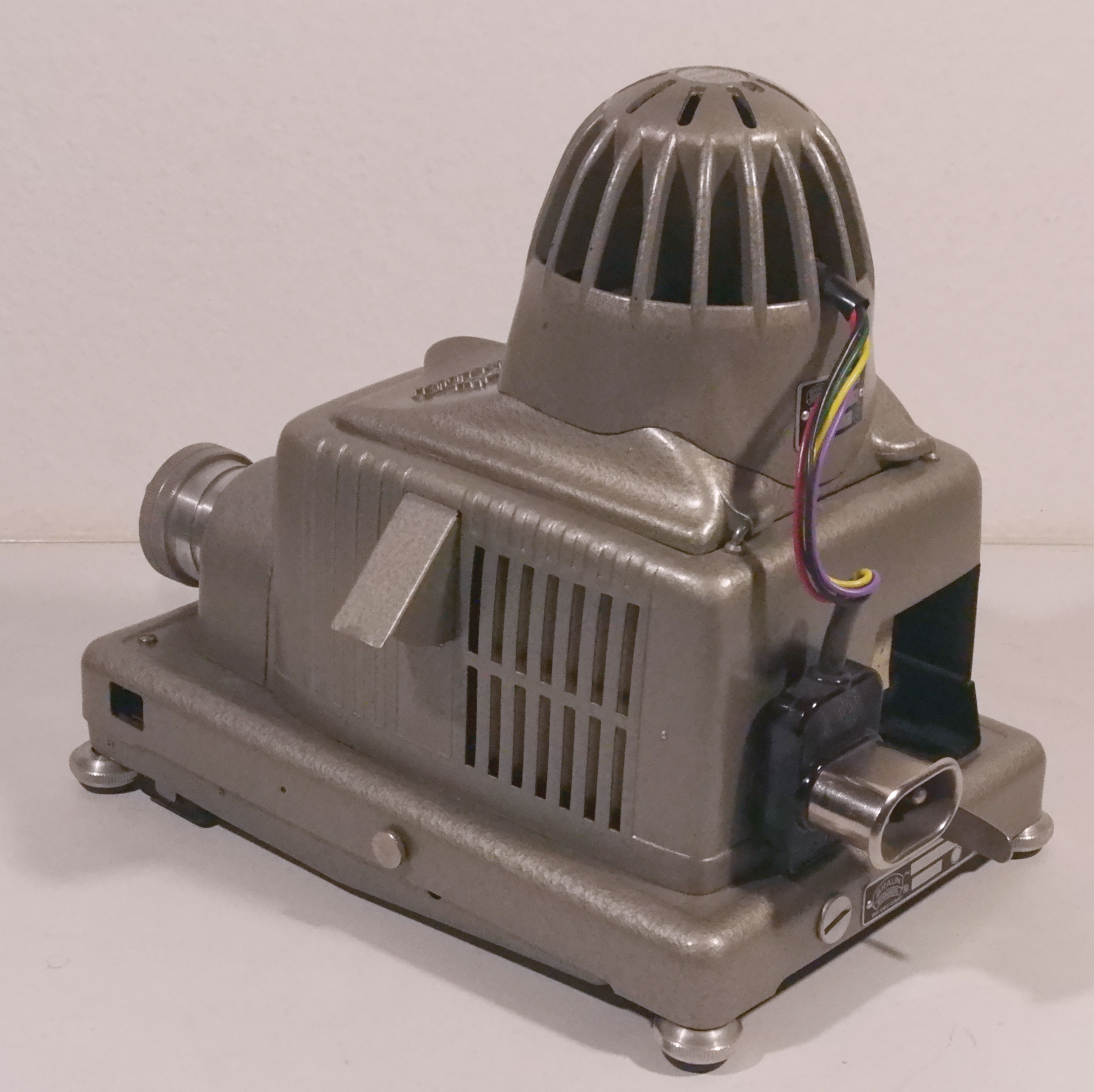 Zubehör: ........................... Lüfter Einer der ersten Dia-Projektoren mit motorischem Bildwechsel. Noch keine motorische Fokussierung Die Lüfter-Verkabelung ist original. Interessant auch das massive Druckguss-Gehäuse im Vergleich zu den Plastik-Gehäusen der letzten Paximat-Modelle, die zumindest in derselben äußeren Form auch heute noch für einen Dia-Scanner gefertigt werden.