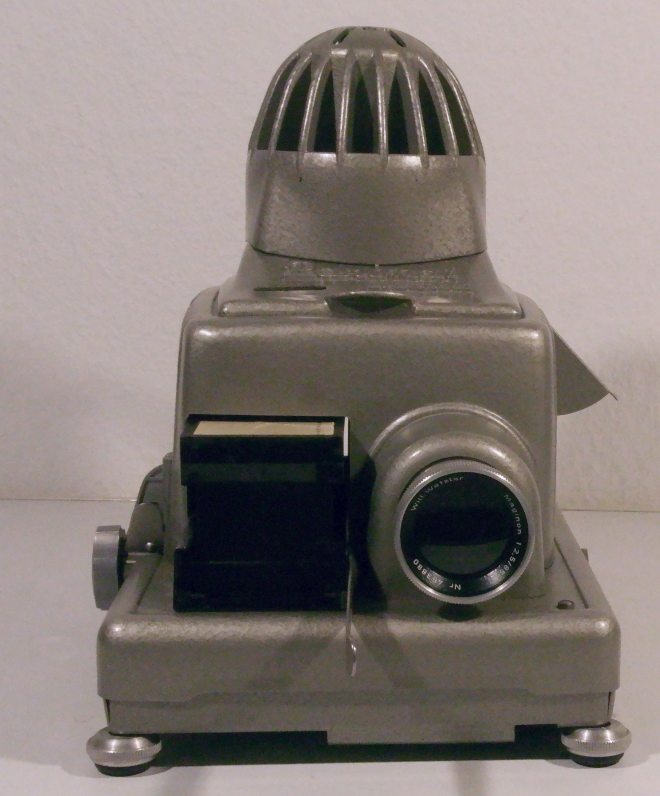 Dachkammerfund: Modell: .............................. Braun Paximat electric; Lichtquelle: ....................... 150W Ba 15 S Objektiv: ........................... Will Wetzlar, Maginon 1:2,5 85mm (4-Linser) manuell zu fokussieren Bildwechsel: ..................... elektromotorisch nur vorwärts mechanisch: Dia-Schiebe-Bügel aus der Antriebs-Schiene (rechts neben Transport-Rad) aushaken Bügel bis Anschlag ziehen (Dia ins Magazin zurück) Transport-Rad in/gegen Uhrzeigersinn (vor/zurück) drehen