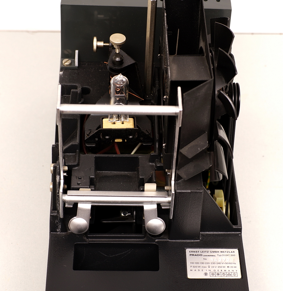 der Prado-universal wurde an Universitäten und Gymnasien als Nachfolger des Prado 250 verwendet. Für einzelne Dias, Filmbänder, Mikroskop-vorsätze, Untersuchungen im polarisierten Licht benötigte man den Prado und seinen Nachfolger. Es gab laut Leitz-Katalog auch einen "Magazinwechsler auf Anfrage". Den habe ich nie gesehen. Für Vorführungen mit Magazinen hatte Leitz zur gleichen Zeit den Pradovit-color auch als Pradovit-color 250 autofocus im Angebot. Die Beleuchtungseinheiten (Spiegel, Lampe, Kondensoren) von Prado-universal und Pradovit-color sind übrigens identisch.
