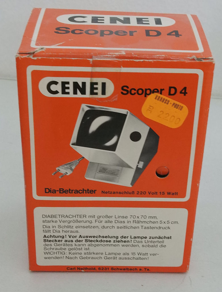 CENEI (Carl NEIthold) Scoper D4; Funktionsbeschreibung auf Karton. Der schwarze Griff dient zum Einschwenken einer waagrechten 24 x 36 - Maske. Der orange Quader hindert das eingeworfene Dia am herausrutschen und wird mit der orangen Taste versenkt. Ungerahmter Film kann seitlich eingefädelt werden..