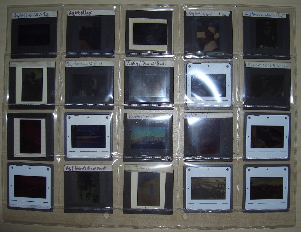 Aufbewahrung in speziellen Klarsicht-Folien mit Kammern. Es gibt unterschiedliche Einschätzungen. Die einen sagen das ist gut, andere meinen, das darin entstehende Mikroklima schadet auf die Dauer. Ich bin hier auch nicht ganz sicher, zumal DIAs aus den Sechzigern und Siebzigern sowieso schon gelitten haben und Farbstiche und Ausbleichungen aufweisen.
