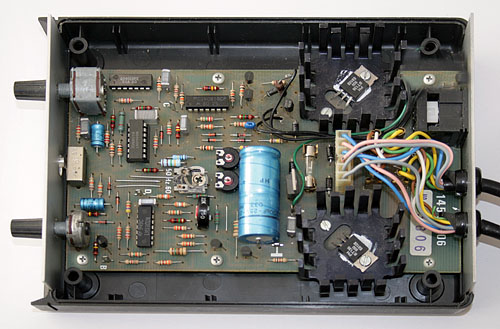 Die Triacs (BT138) für die Lampensteuerung befinden sich nicht in den Projektoren, sondern im Steuergerät (im Bild rechts mit den Kühlkörpern). Die Platine ist konventionell mit CMOS ICs (reparaturfreundlich) aufgebaut.