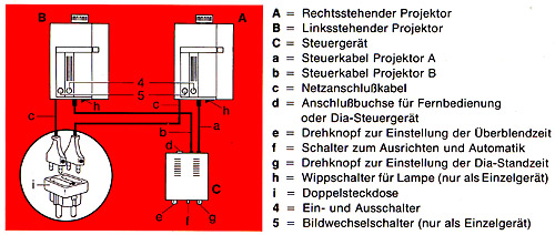 Bedienung: 2 Drehknöpfe für Standzeit (bei Automatikbetrieb) und Überblendzeit Schiebeschalter für Diaausrichtung (beide Lampen ein) und Betrieb Kabel-Handsteuerung für manuellen Diawechsel (1,8 m)