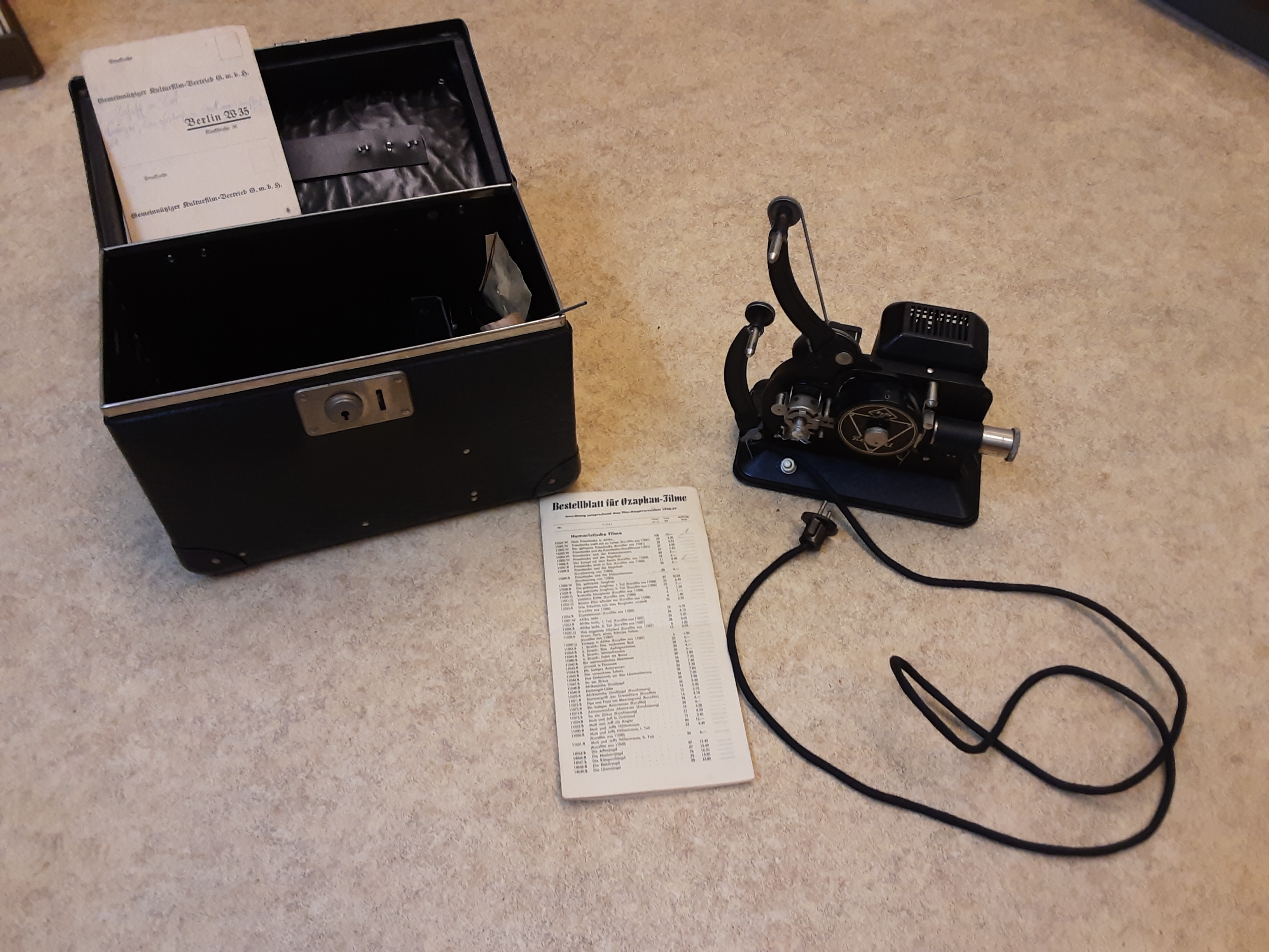 Der Gegenstand auf den Bildern lag in einem Koffer aus Vorkriegszeit in dem ein Agfa Filmprojektor enthalten ist. Die Marke ist Zeiss Ikon und auf der ein Seite steht "Schneiden" auf der anderen "Schaben". Ist das möglicherweise zum Filme schneiden? Kann jemand sagen ob das Gerät so vollständig und noch zu benutzen ist? Und kenn eventuell jemand die genaue Produktbezeichnung?