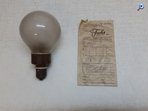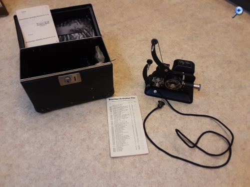 Dein Link zu dem Projektor, Begriffe wie "Doppelperforation", " Klebepresse" und so weiter, geben mir gute Anhaltspunkte um als absoluter Anfänger weiter zu forschen. Ich stelle mal noch ein letzten Bild und eine Frage ein, auch wenn ich nicht weiß ab es noch dazu gehört. Sollte ich noch weiter Dinge hochladen, erstelle ich einen neuen Beitrag wenn das in Ordnung ist. Auf der Kiste lag eine große Glühbirne und in der Kiste eine alte Rechnung über 110 (Reichsmark?, DM mark?) zu einer Birne. Ob die rechnung zu der Birne gehört weiß ich nicht. Da noch der Familienname "Jäger" drauf steht, muss diese sehr alt sein. Ich kann hier nur einen großen Zeitraum taxieren von 1900- max 1960.