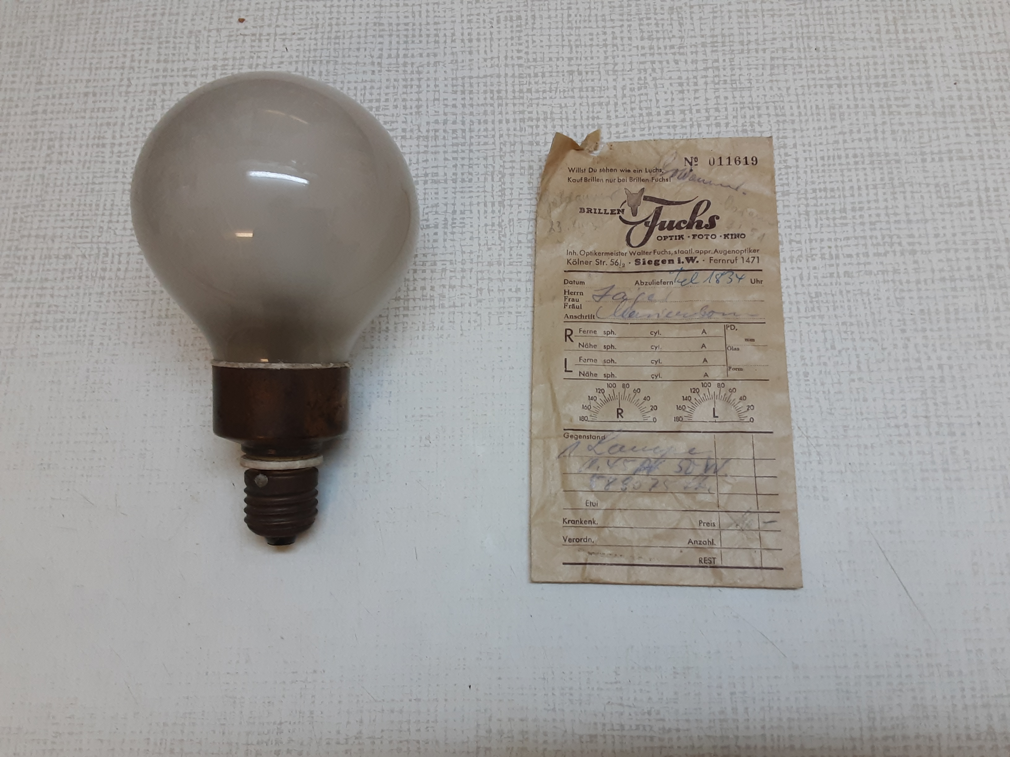 Nur ein kurzes Reinschauen hinterlässt für längere Zeit "verblitze" Augen. Des Weiteren wird die Birne auch nach ein paar Sekunden extrem heiß, so dass man sie für eine gewisse Zeit nicht anfassen kann. Oben rechts auf der Rechnung meine ich in schwacher Bleistiftschrift "Osram 3T51" erkennen zu können.