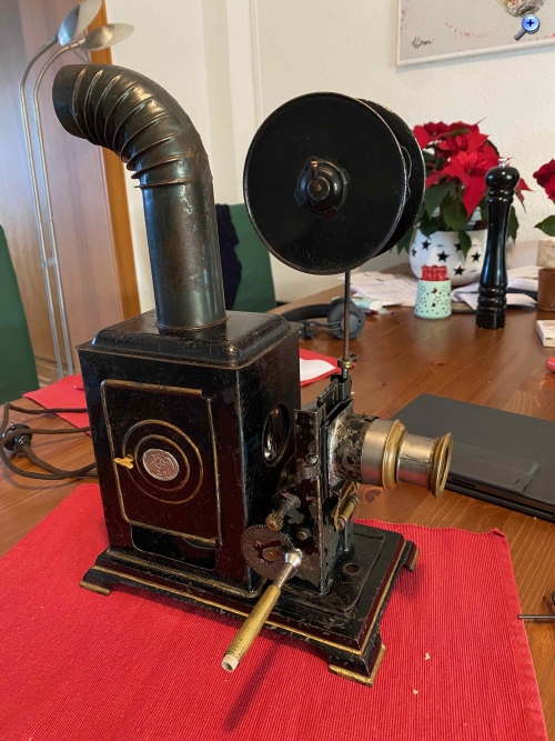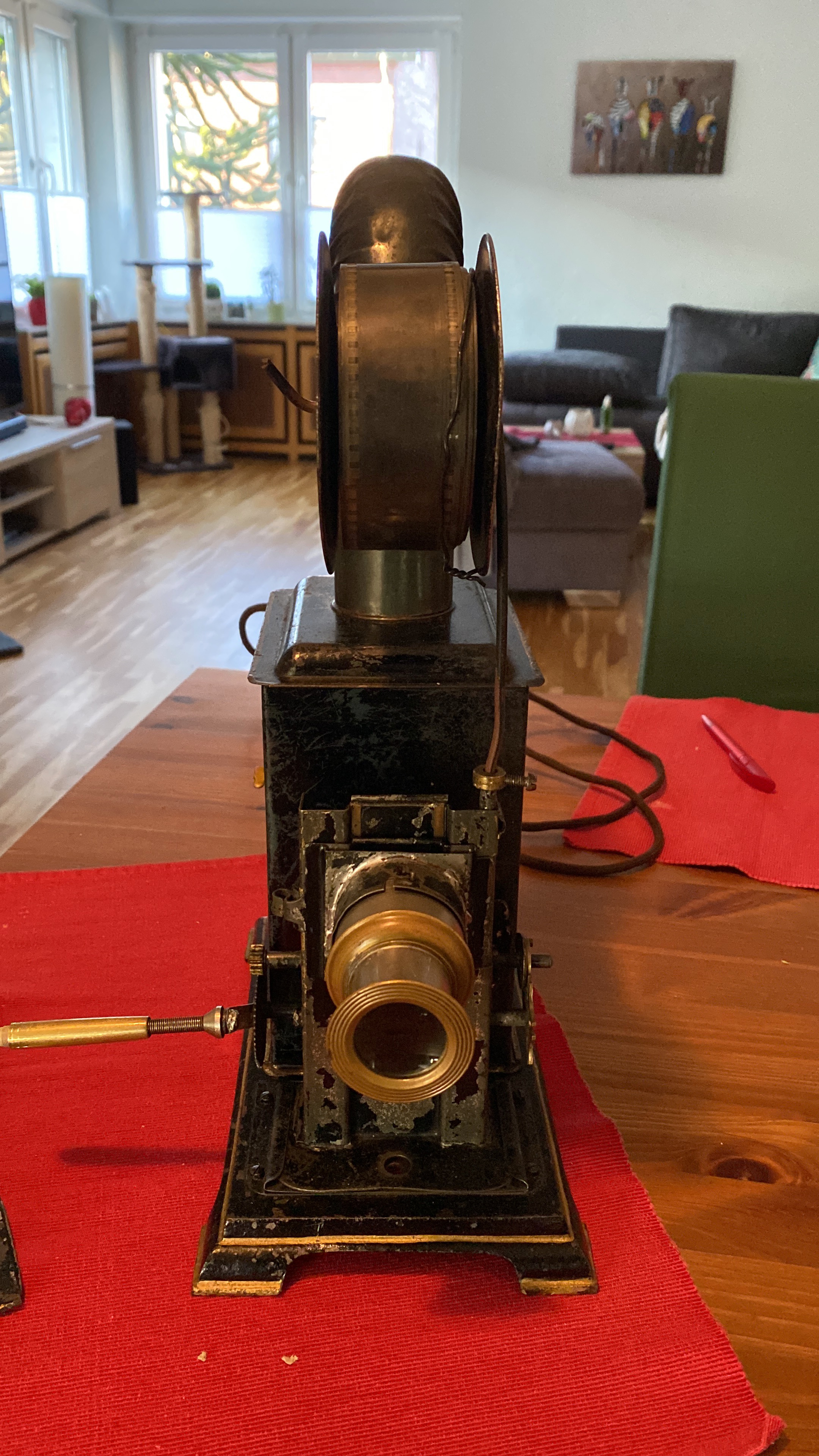 man kann auf Deinen Fotos nicht erkennen, wie die rechte Seite des Projektors aussieht. Wenn da kein Ansatz für eine Aufwickelspulenhalterung mit Antriebsriemen ist, dann ist der Kinematograph nicht für Langfilme vorgesehen. Das lange Filmstück kann auch sozusagen als Versuch des damaligen Anwenders gedeutet werden.