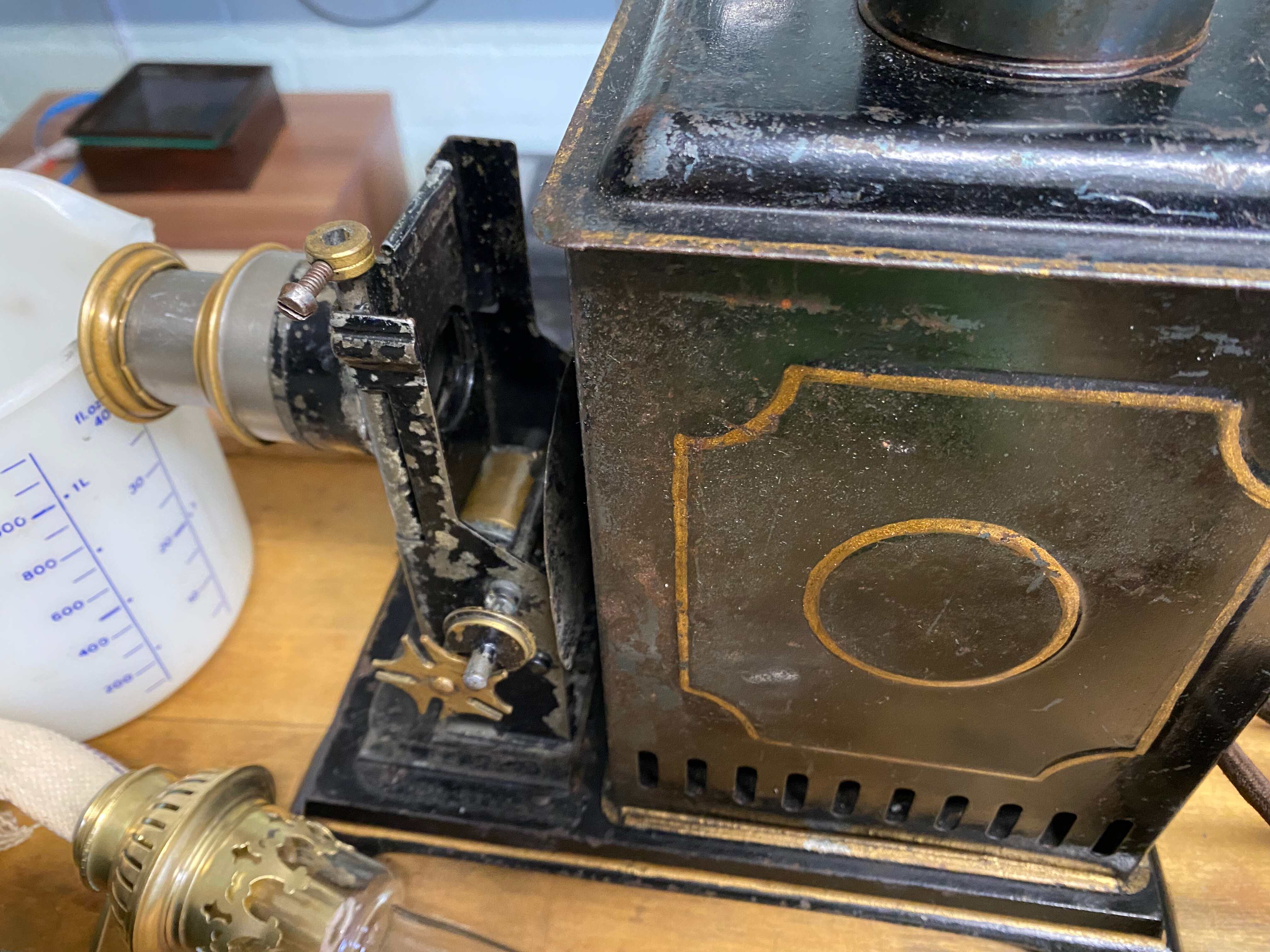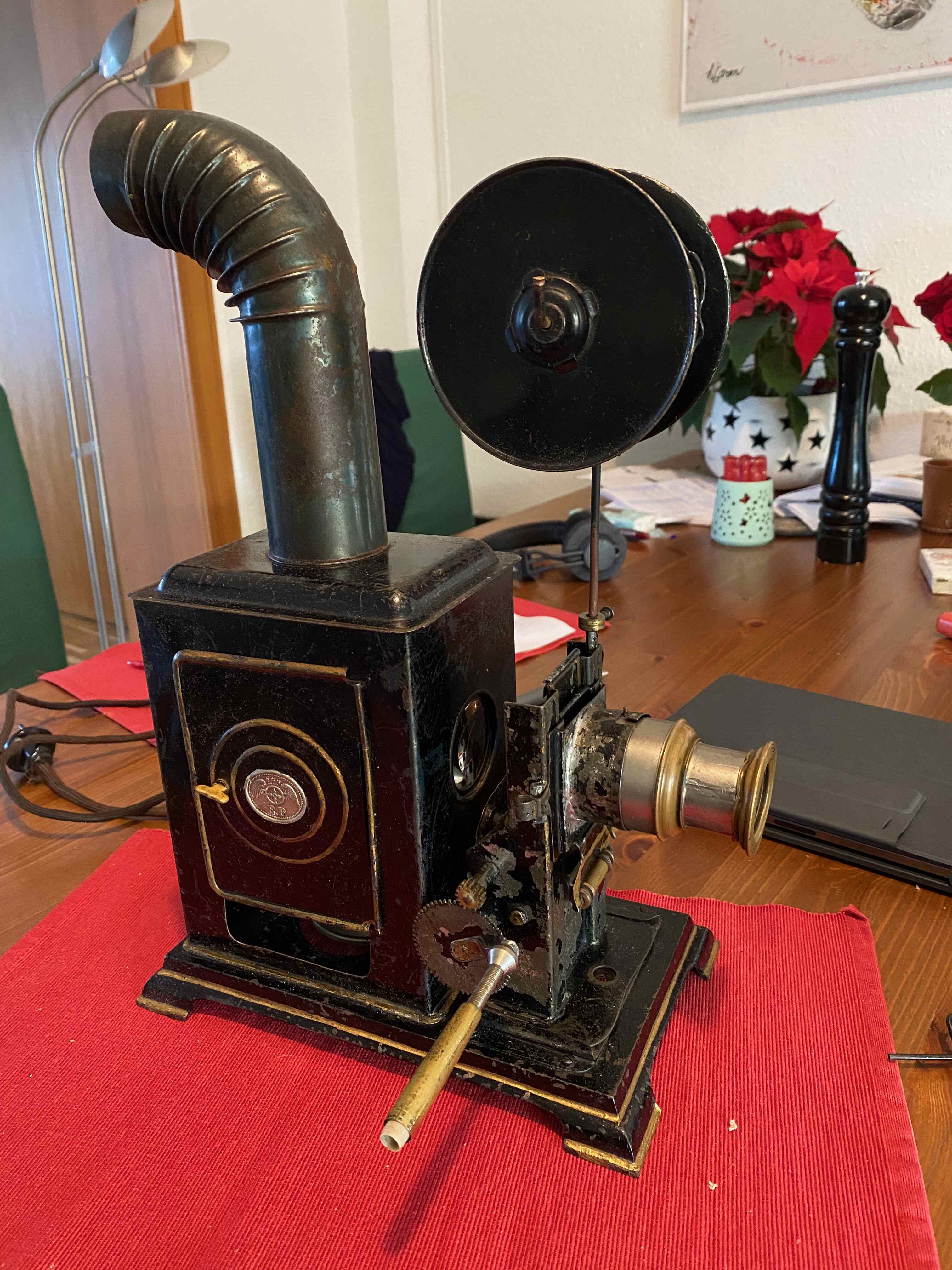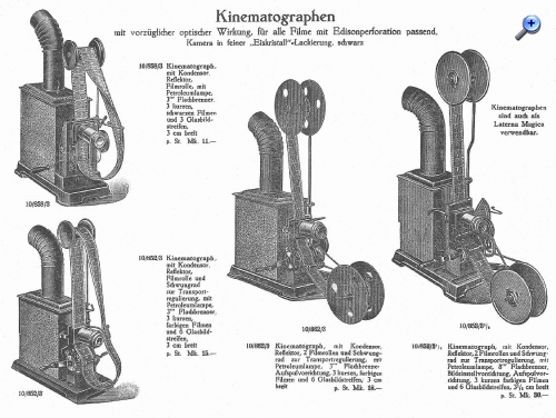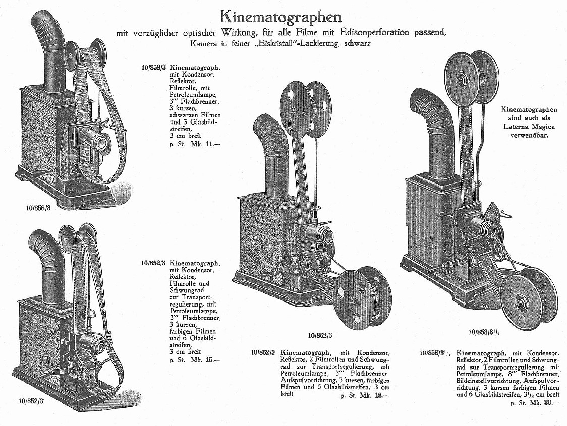 Der Kinematograph kann nicht nur zur Filmwiedergabe, sondern auch als Laterna magica verwendet werden. Als Beleuchtung kann sowohl elektrisches Licht, als aber auch eine Petroleumlampe verwendet werden. Daher auch der Kauf von mir.