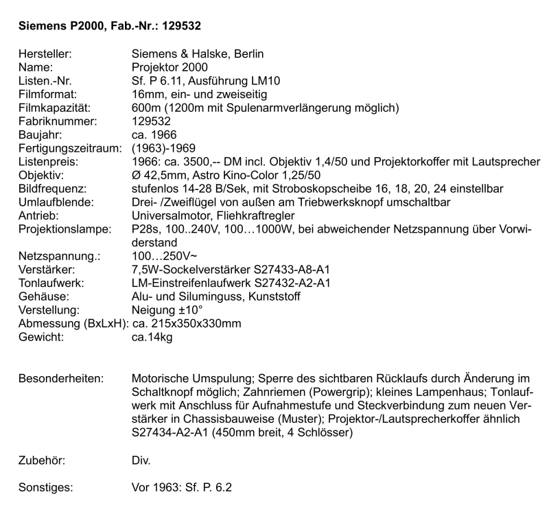 Hier als Ergänzung ein P2000 in der Ausführung nach 1963. Es gab viele Änderungen: Die Stummfilmausführung ist durch die Verwendung von Siluminguss und Kunststoff 1,25kg leichter, zum Umrollen wird das Getriebe beim Hochstellen des hinteren Spulenarmes ausgekuppelt, die Filmführung kann ausgetauscht werden (wie beim alten Standardprojektor), der Schalteinsatz wurde verändert, der Vorwiderstand ist nicht mehr frei zugänglich, die Lampenschutzkappe kleiner und vieles mehr. Leider hat sich der neu eingeführte Antrieb mit Flachriemen nicht auf Dauer bewährt, Siemens bot deshalb einen Umbausatz auf den bewährten Keilriemenantrieb an.