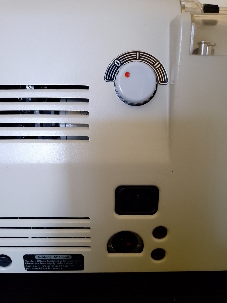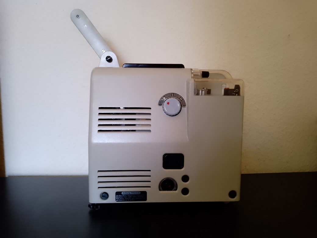2. wird zur Ausleuchtung der Projektionsfläche bereits eine der seinerzeit neuentwickelten Halogenlampen verwendet. Um diese, damals wohl recht teuren, Lampen schonen zu können befindet sich auf der Rückseite des Projektors ein seperater Projektionslampenschalter mit 3 Einstellmöglichkeiten: 0=aus, I=Sparschaltung, II=volle Lichtleistung