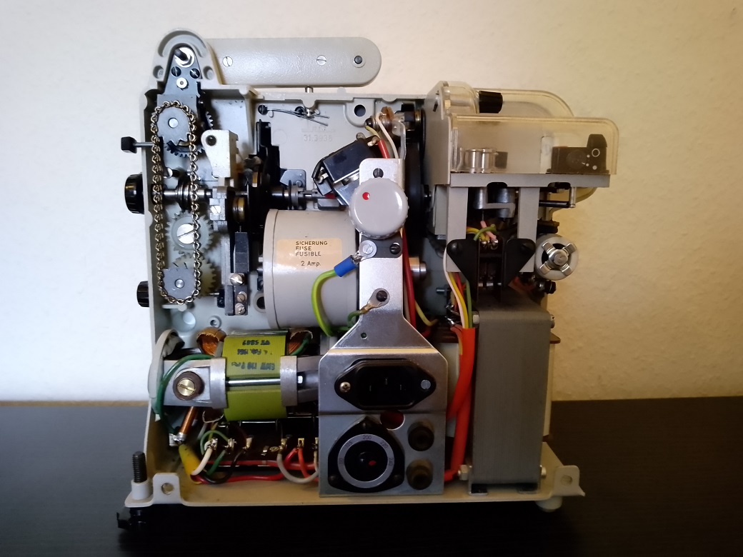 Auf den ersten Blick ist der Projektor ein typischer Vertreter der Normal 8 / Doppel 8 Fraktion aus dieser Zeit. In Ganzmetallauweise bringt das Gerät ca. 6,5 Kg auf die Waage. Auf den zweiten Blick eröffnen sich dem Betrachter allerdings einige Besonderheiten:
