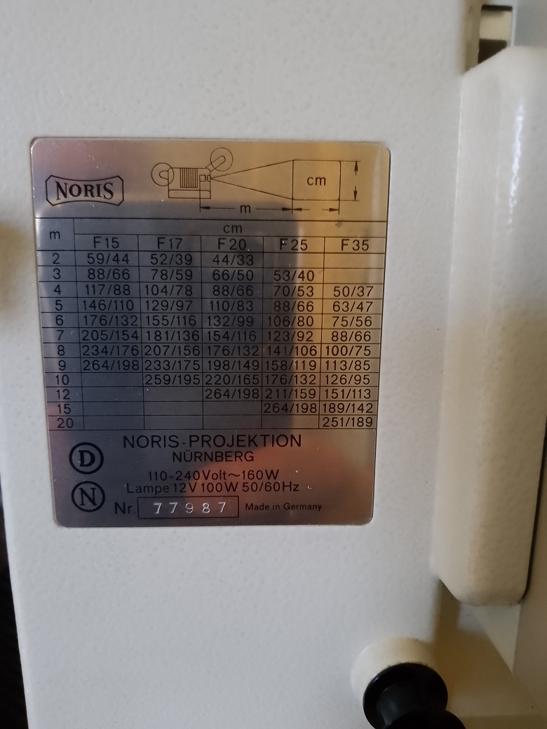 Hersteller: Noris Projektion, Nürnberg Baujahr: 1960er Jahre Typ: Normal 8 / Doppel 8 Projektor mit eingebautem Tonkoppler "Synchromat" Modell: Synchroner 200TS mit Vor- und Rückwärtsprojektion und Standbild Seriennummer: 77987 Bildgeschwindigkeit: stufenlos über Drehrad von 6 - 18 Bilder/sec Projektionslampe: 12 Volt / 100 Watt Stiftsockellampe Objektiv: ISCO-GÖTTINGEN VARIO-KIPTAGON 1:1,6/15-25 mm max. Spulengröße: 120 Meter Neupreis: nicht bekannt