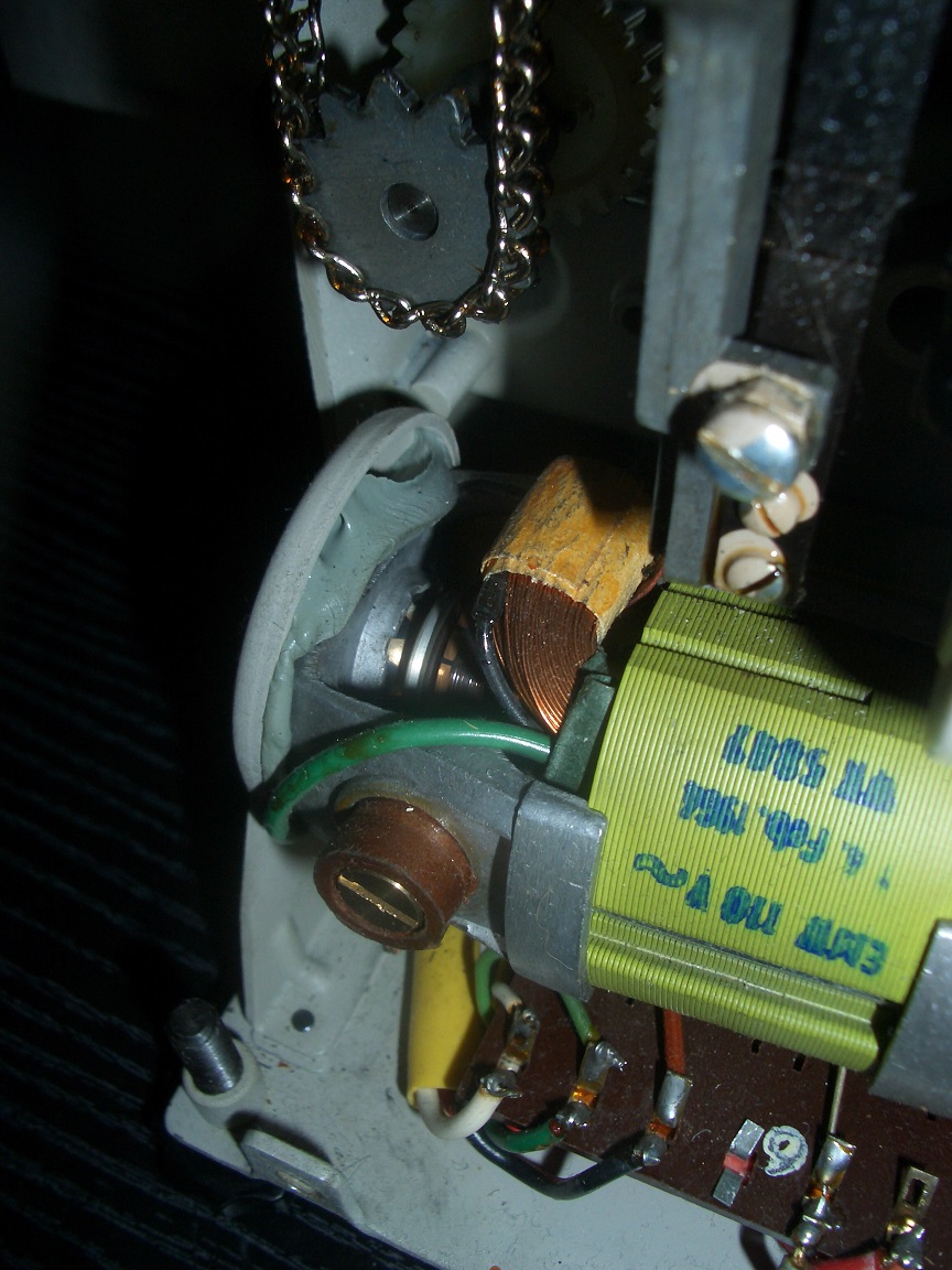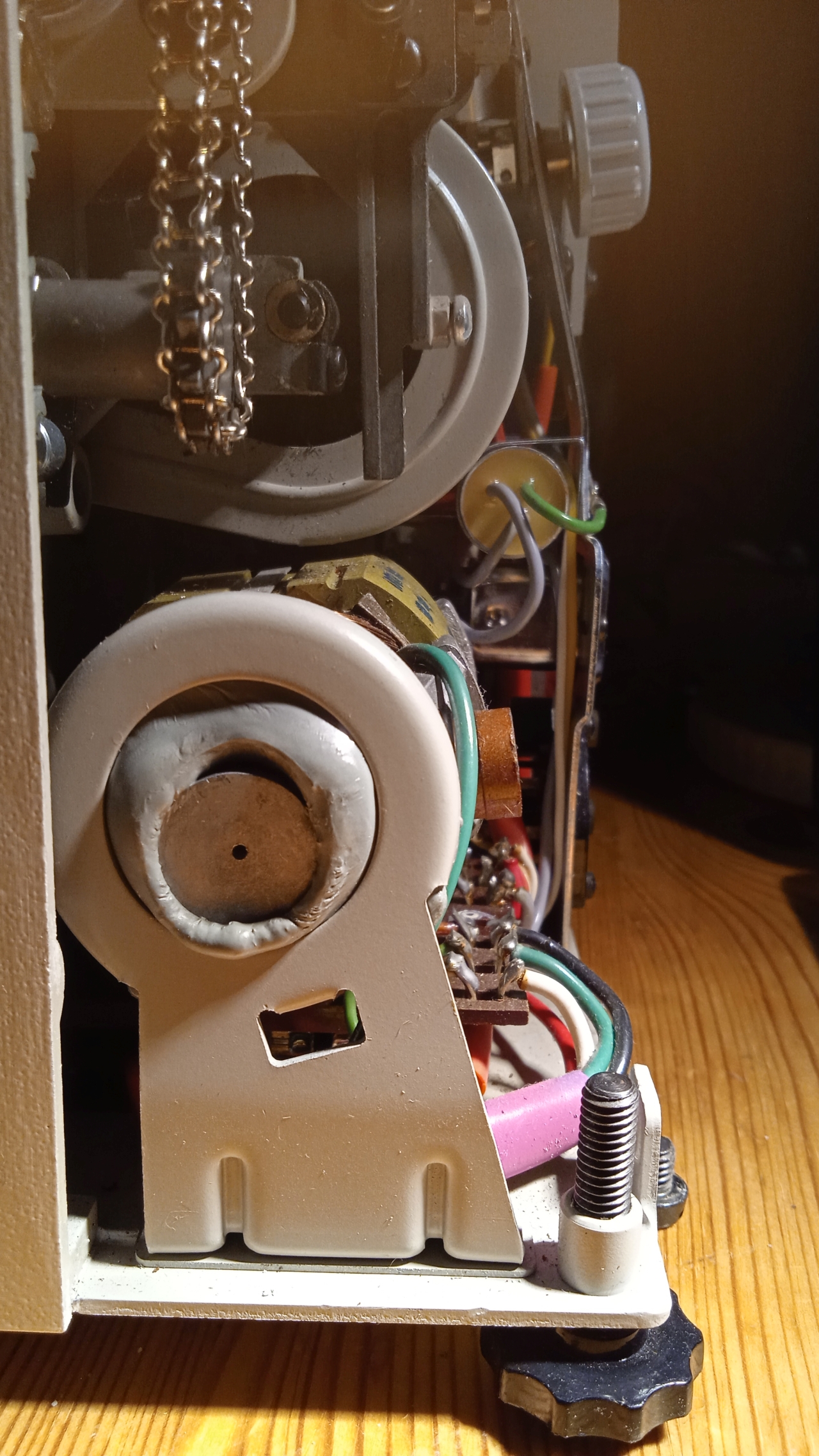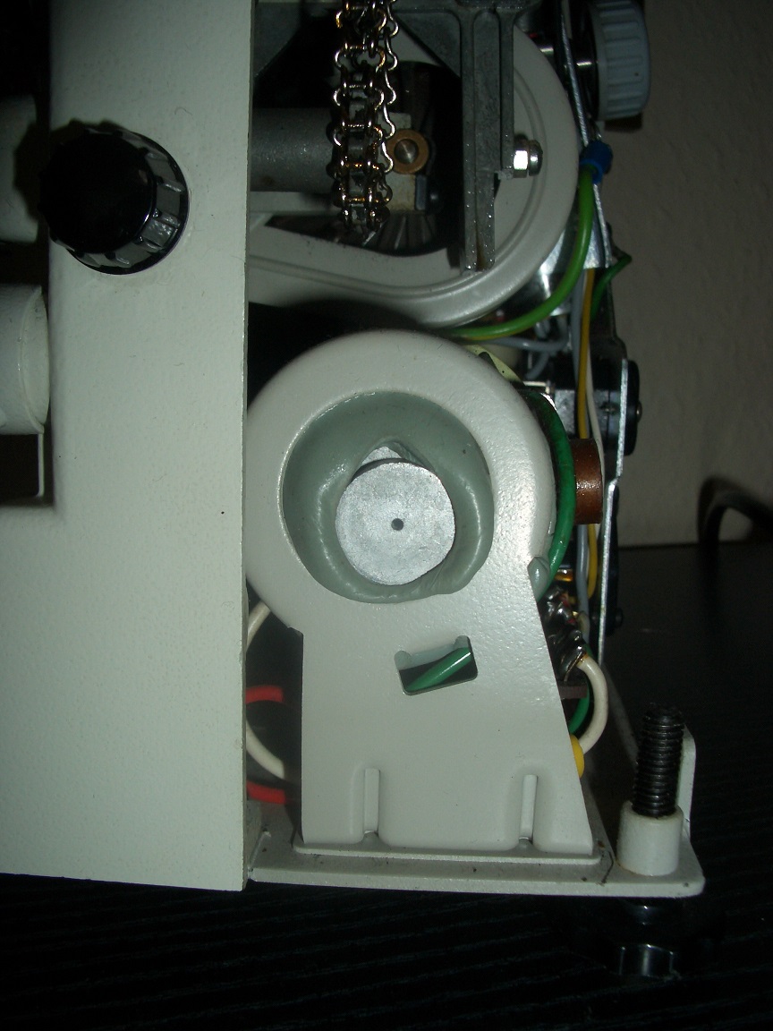 ich habe die schönen Fotos vom Noris Synchroner 200 TS gesehen. Ich habe jetzt selbst so ein gutes Stück geerbt und dazu viele Normal 8 Filme. Im Prinzip funktioniert der Projektor, machte aber einen wahnsinnigen Lärm. Nach dem Öffnen des Geräte stellte ich fest, dass der Motor ziemlich warm war und (dadurch?) die Achse nicht mehr zentrisch in der Aufhängung (s. Foto). Ich hoffe jetzt auf einen Hinweis, was zu tun ist, damit ich mir noch viele Filme 'in Ruhe' anschauen kann.