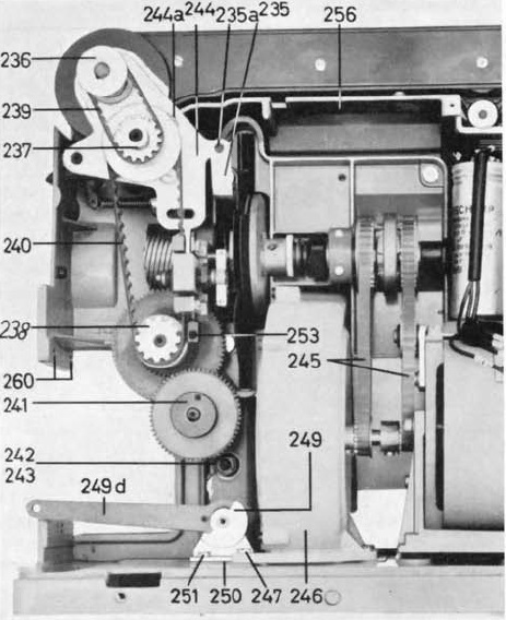 so intensiv hatte ich mich mit dem Ersatzteilkatalog noch nicht auseindergesetzt obwohl er schon ein paar Tage auf der SSD schlummert. Abb. 22 zeigt (vom Zahnrad für den Tonabnehmer abgesehen) genau die Situation wie sie in / an meinem P5 vorzufinden ist. Es drängt sich in der Tat der Verdacht auf, dass die Kupplung für die unterschiedlichen Geschwindigkeiten händisch eingerastet werden muß. Wie die Verstellung für die Umlaufblende erfolgen soll erschließt sich mir derzeit noch nicht. Der bei Kinobauer verfügbare Katalog datiert vom Januar 1962. Heißt das evtl., dass aus Rationalisierungsgründen die Verstellhebel eingespart wurden? Laut dem Aufdruck auf den Kondensatoren ist mein Projektor ab Oktober 1961 entstanden, würde folglich zeitlich passend sein.